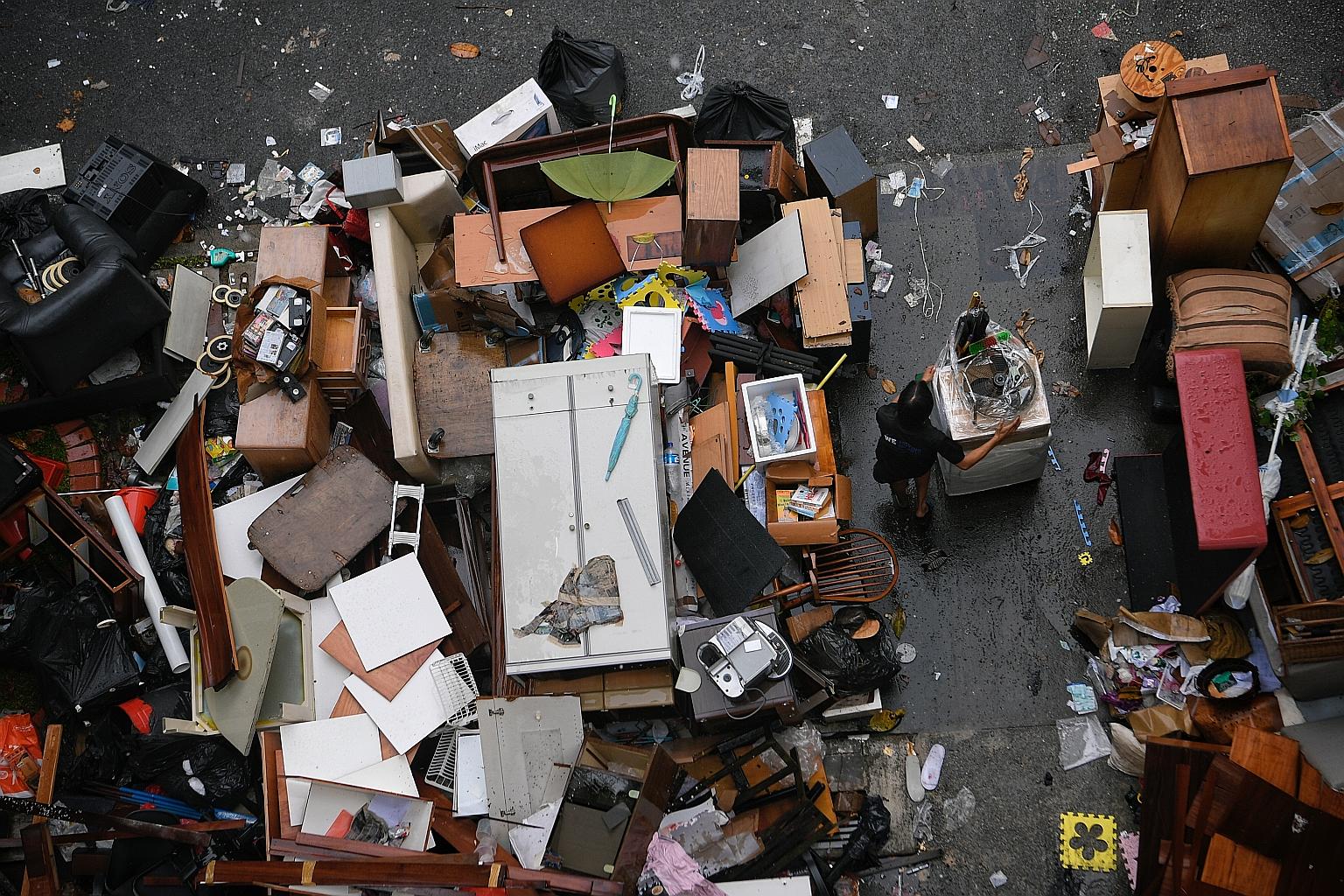 A mover transporting a resident’s belongings last weekend. Over the last two months, the void decks of Shunfu Ville’s six blocks have been filled with piles of discarded items and old furniture.