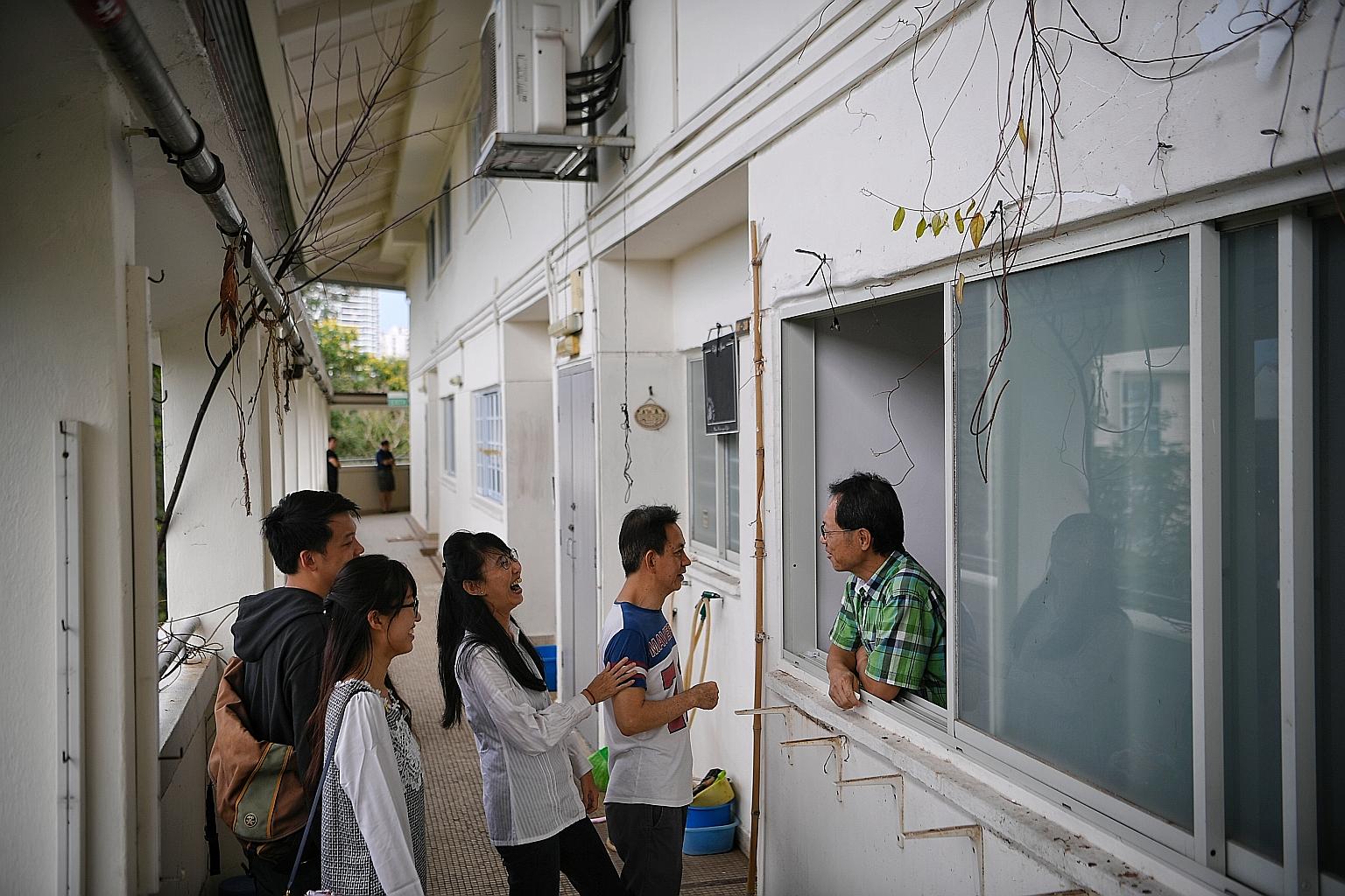 Mr Wong Siew Seng, 60, leaning out of his window to chat with his neighbour Howard Lim, 61, Mr Lim’s wife Lay Kian, 56, daughter Woon Ching, 26, and son-in-law Law Guo Liang, 28. Shunfu Ville was where Mr Wong and Mr Lim set up their first marital homes. Mr Wong recalls that families on the sixth floor would go out for breakfast together and have regular pot-luck parties.