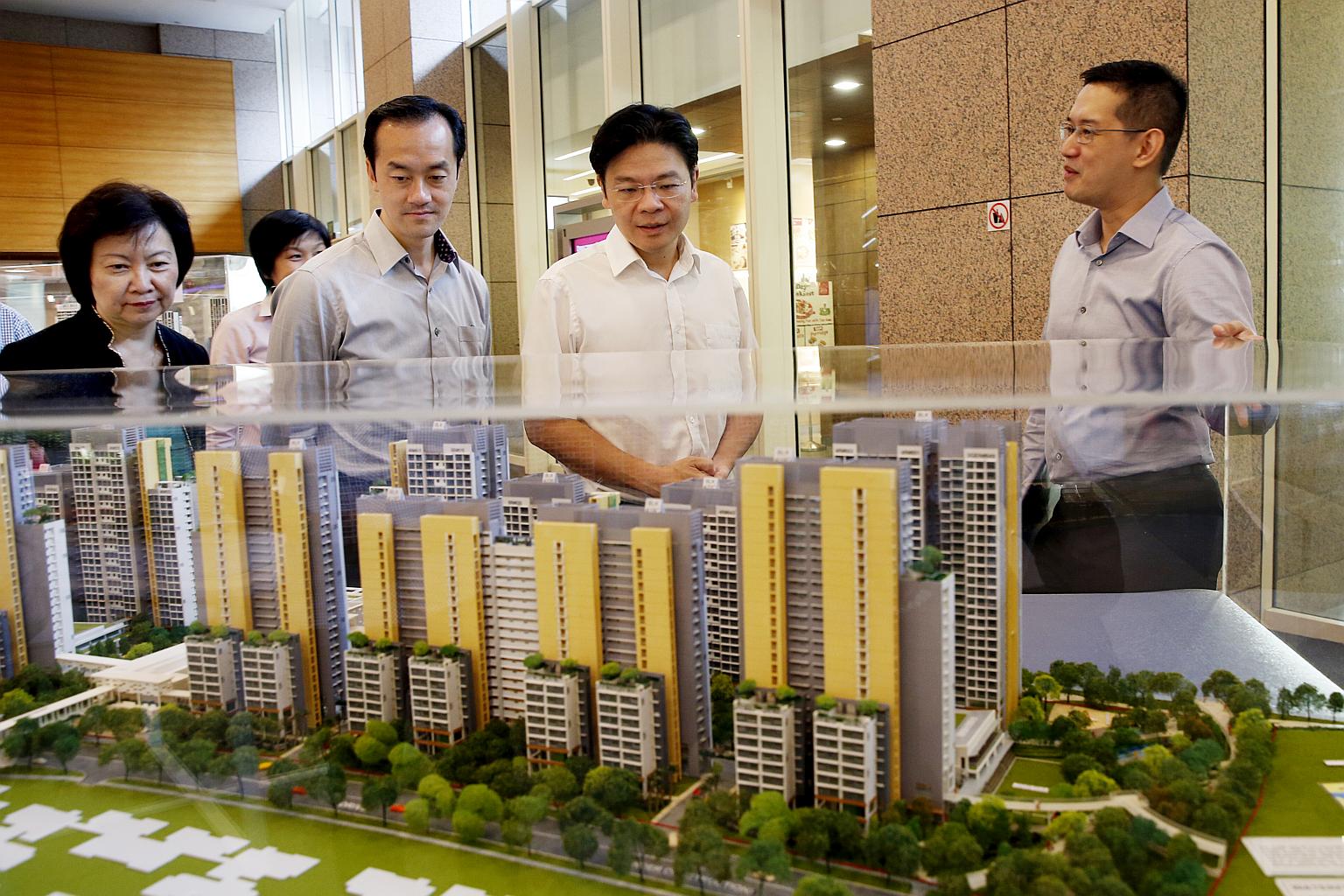 National Development Minister Lawrence Wong (centre) and Minister of State for National Development Koh Poh Koon (second from left) visiting the new sales atrium and My Nice Home Gallery at Toa Payoh's HDB Hub.