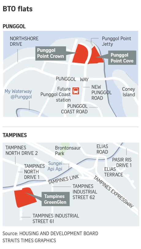 Prices start from $109,000 (excluding grants) for a two-room flexi flat in Punggol, and from $312,000 (excluding grants) for a four-room flat in Tampines.