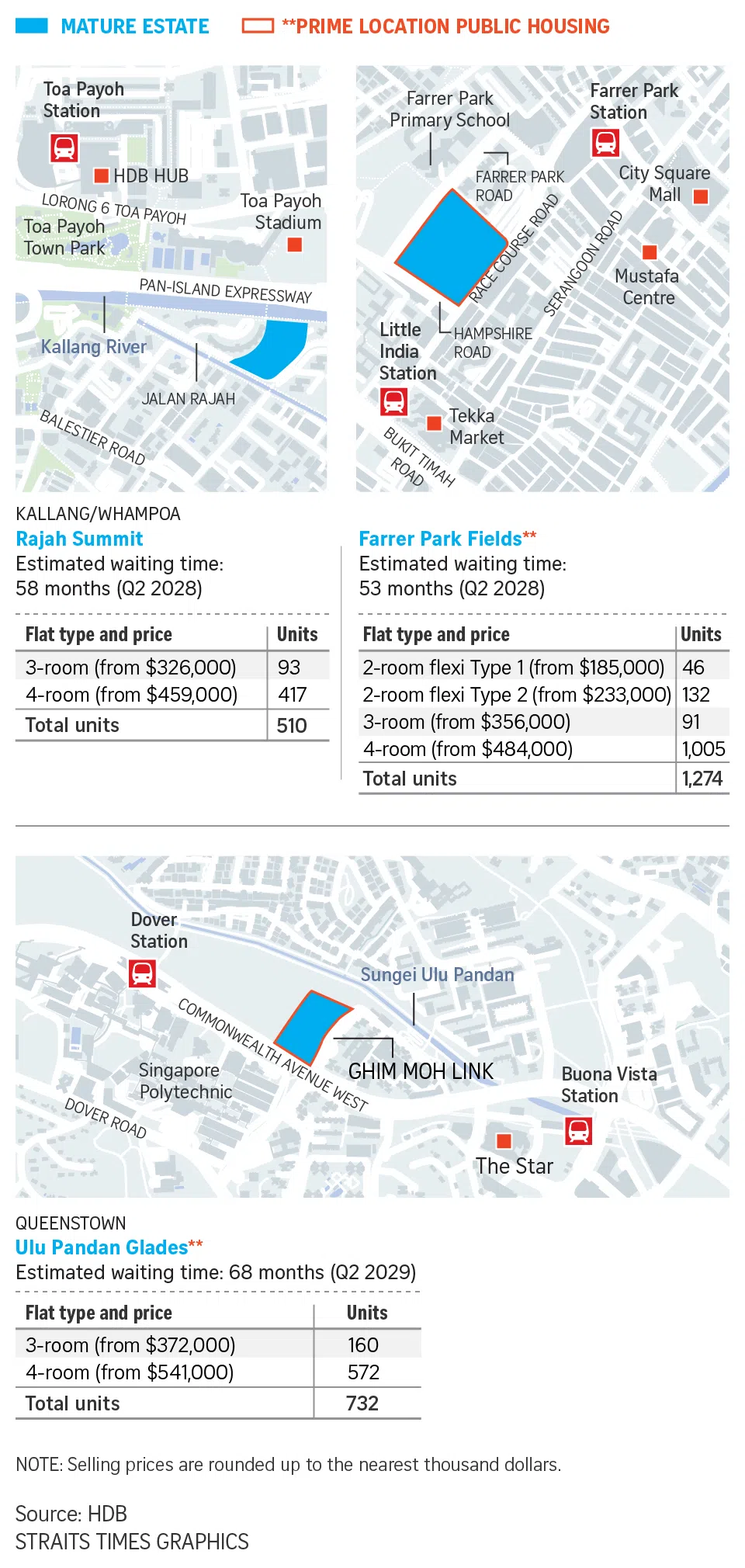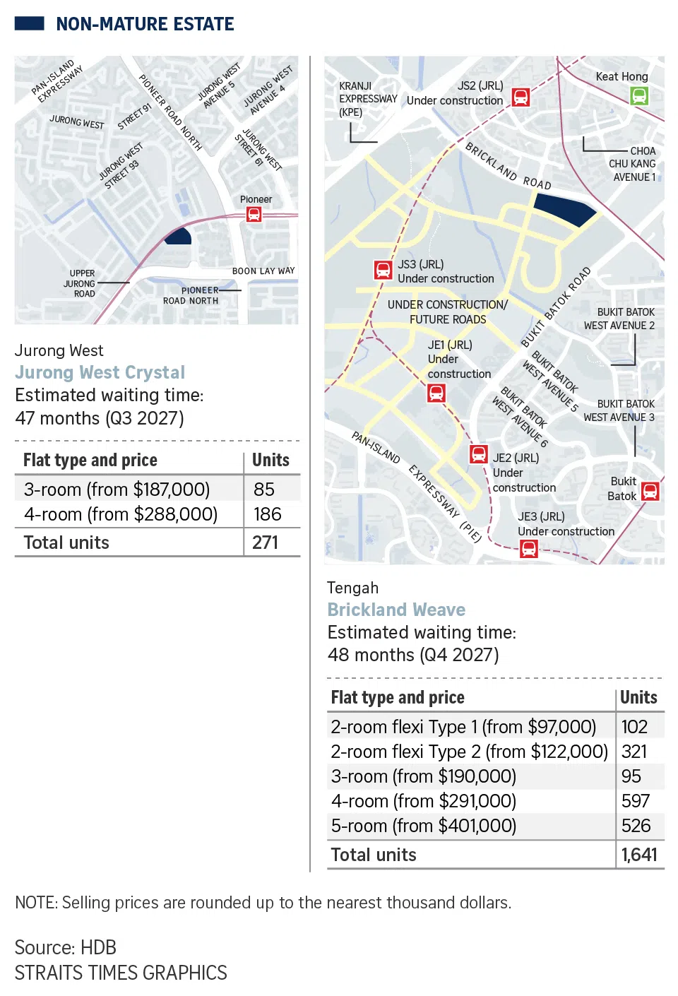 The five projects have a median waiting time of about 4.4 years. HDB said all four-room flats offered in the two non-mature estates are below $400,000, before grants.