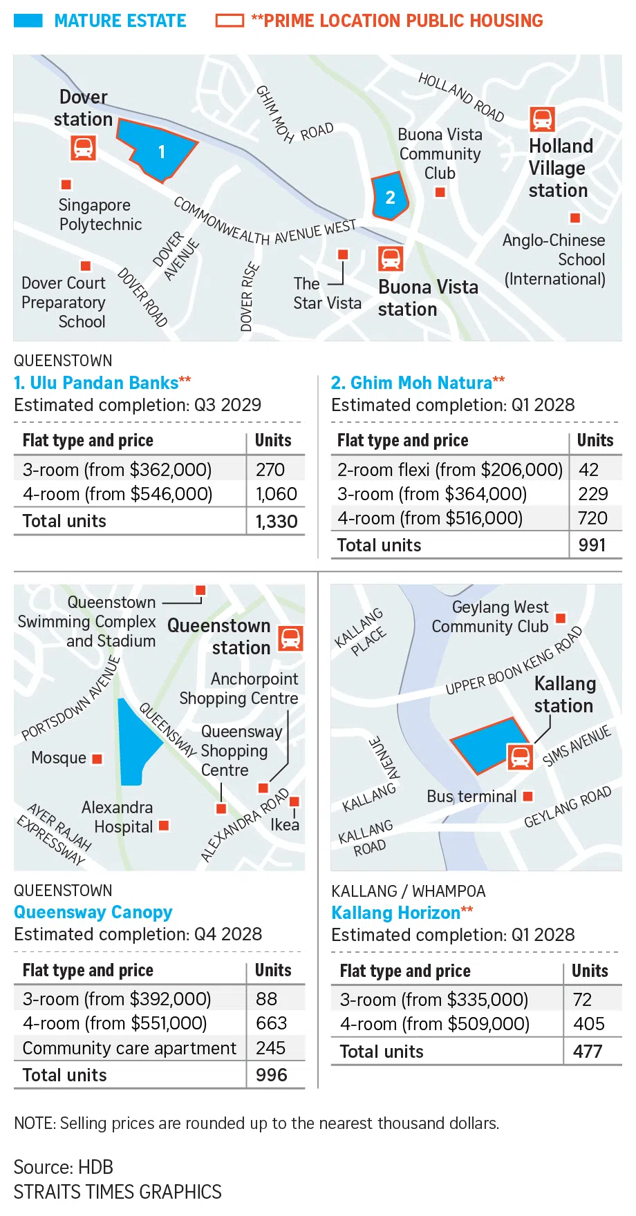 The units are spread across 10 housing projects in five estates. Three of these – two in Queenstown and one in Kallang/Whampoa – fall under the prime location public housing (PLH) model,