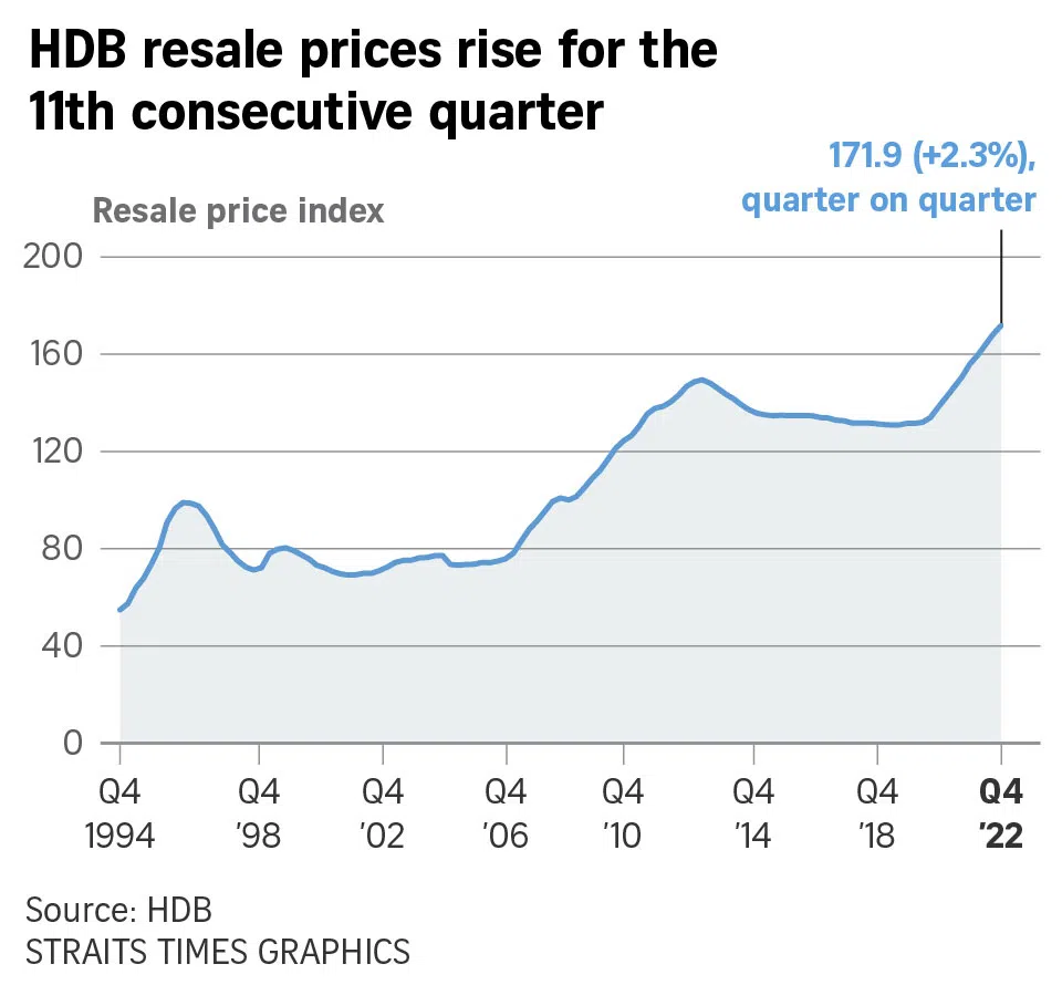 Resale prices rose at a slower pace of 2.3 per cent in the last quarter of 2022, compared with 2.6 per cent in the third quarter, data released by HDB on Friday showed.