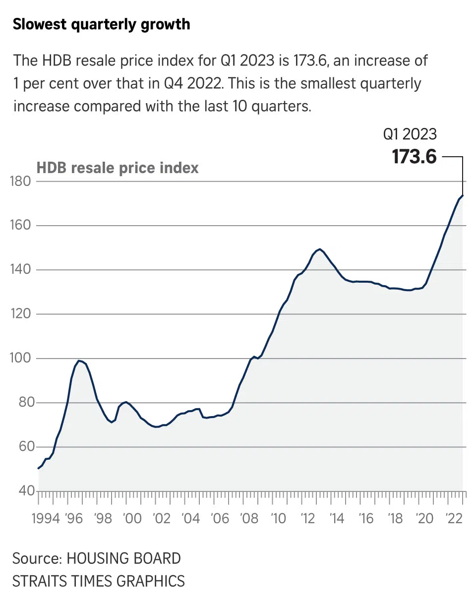SINGAPORE – Prices of Housing Board flats are showing signs of cooling, with resale prices rising at 1 per cent in the first three months of 2023, marking the smallest quarterly increase in the past 10 quarters, or 2½ years.