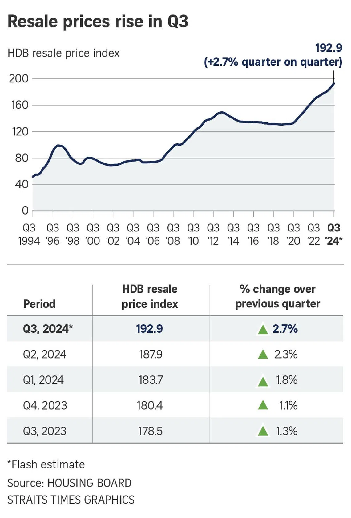 Meanwhile, in the resale market, prices of HDB resale flats rose 2.7 per cent from July to September, which is a quicker pace than the 2.3 per cent growth in the previous quarter, according to data released by HDB.
