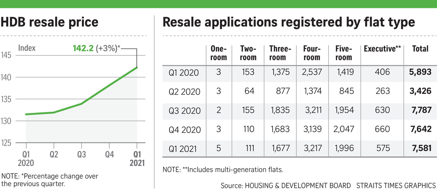 The Housing Board (HDB) resale market remained robust in the first quarter of this year amid Covid-19 vaccine optimism, with prices rising for the fourth consecutive quarter even as fewer flats changed hands.