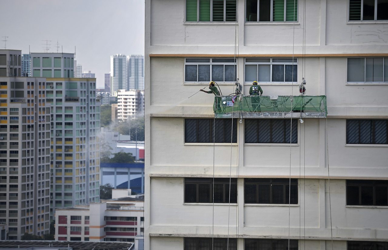 A photo taken on Oct 27, 2018, shows workers washing the walls of the facade of a Housing Board flat in Toa Payoh, as part of the Home Improvement Programme.