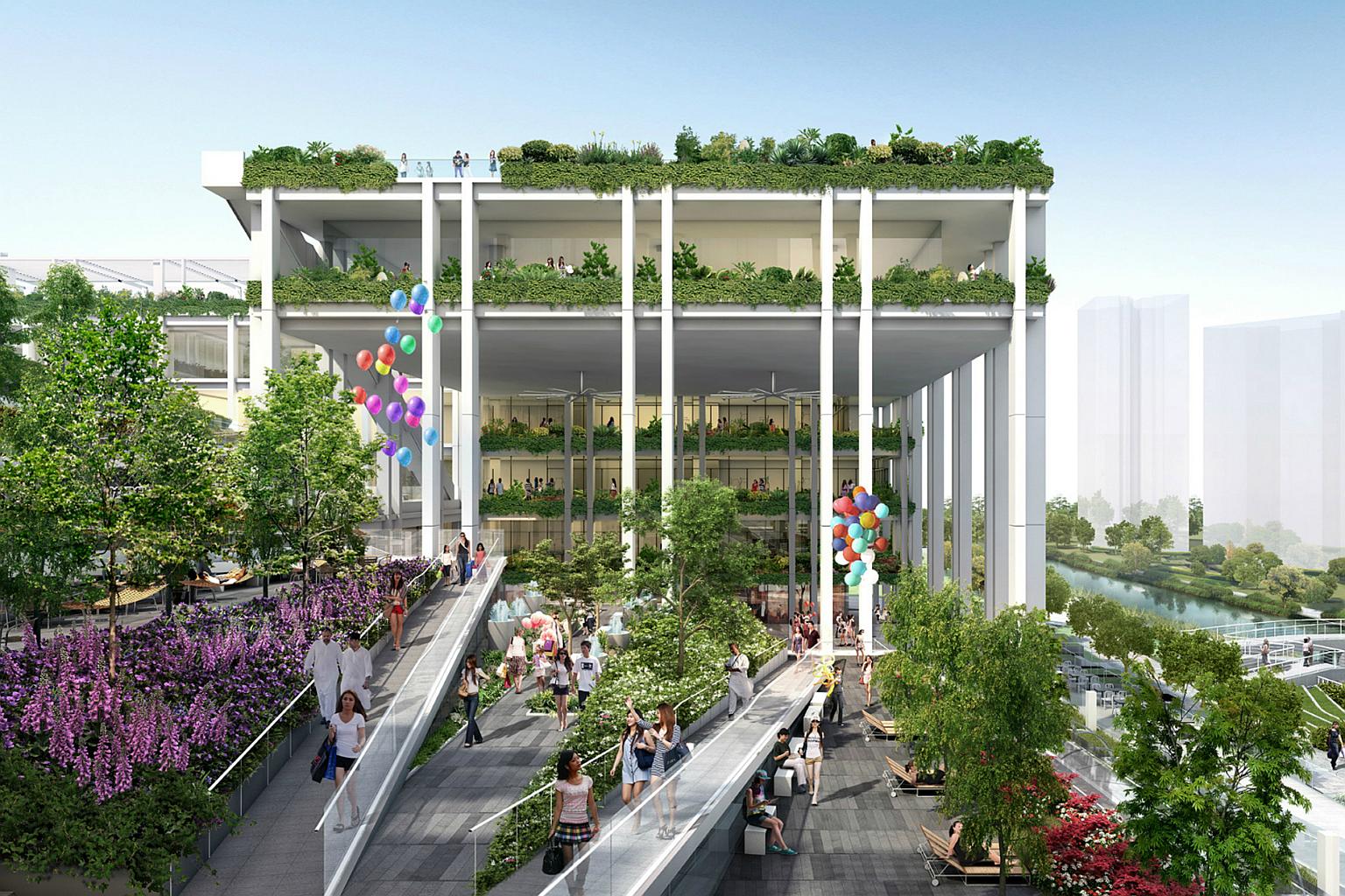 An artist’s impression of the neighbourhood centre located next to Punggol Waterway, where residents can come together to bond over plants and greenery.