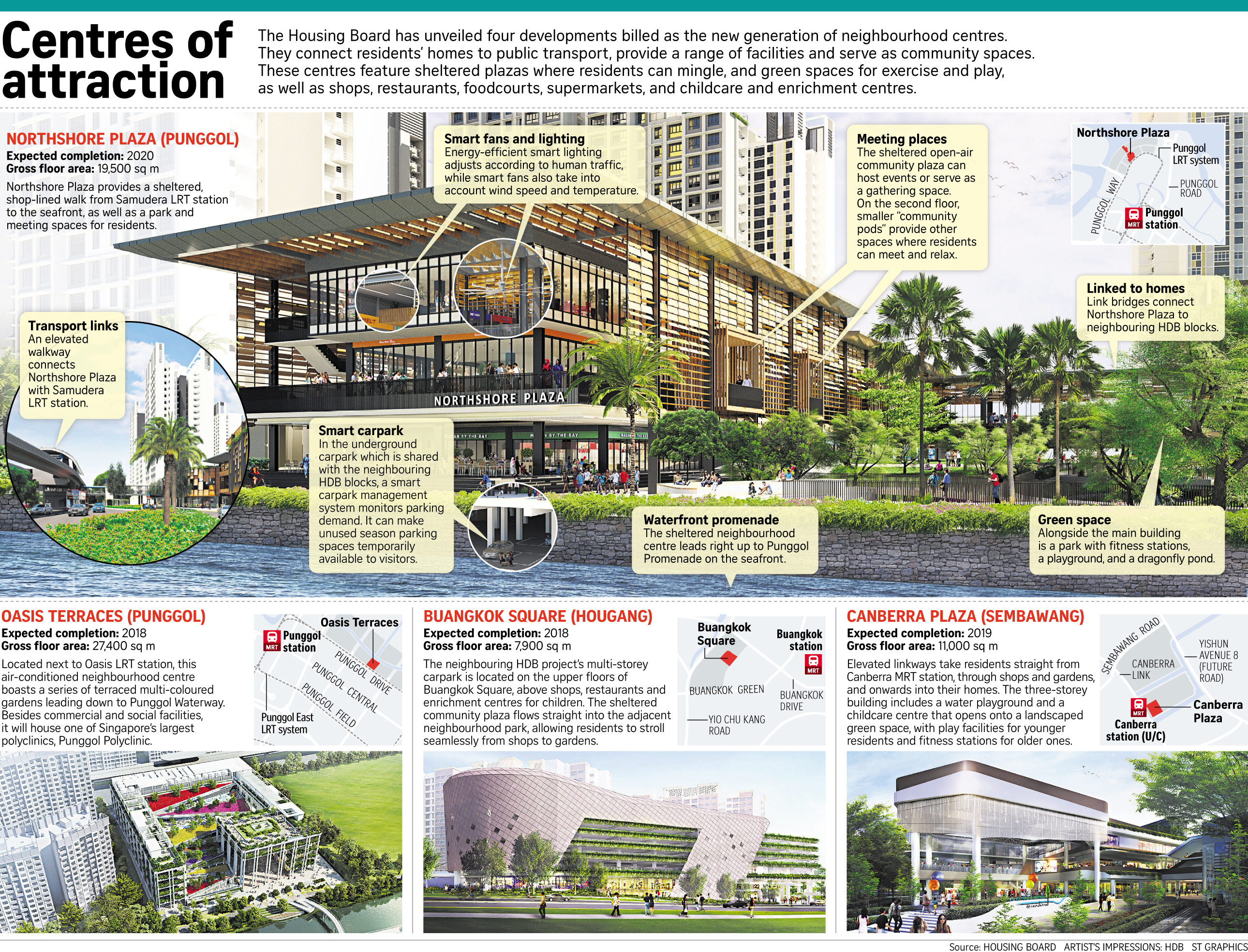 Three of the four new centres are being built at the same time as new HDB estates. Northshore Plaza in Punggol is being built with the Northshore Residences I and II projects, launched in the May Build-To-Order (BTO) exercise, as well as three other Punggol projects to be launched in the upcoming November BTO.