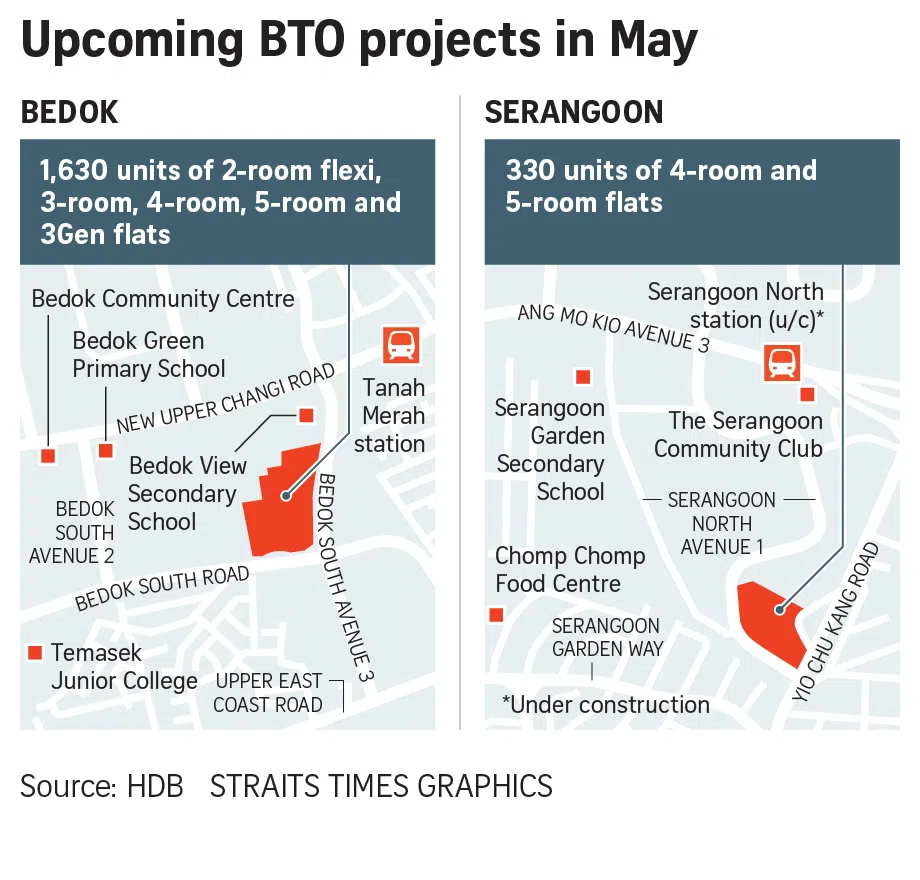 HDB to launch BTO flats in Bedok and Serangoon in May for first time in years; includes 5-room units