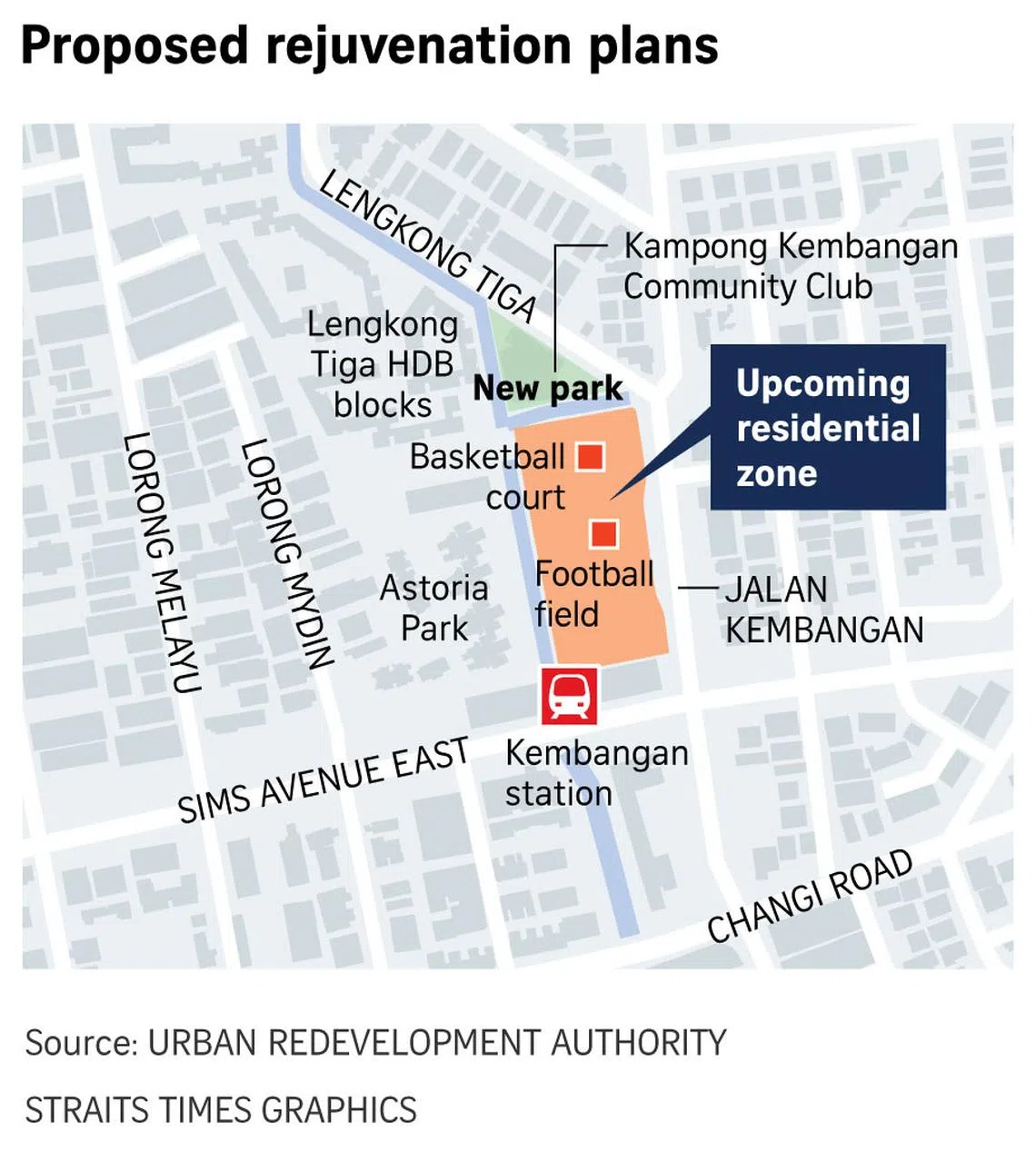 SINGAPORE - A new residential development will be built on a plot of land next to Kembangan MRT station, which currently houses a football field with a running track and a basketball court.