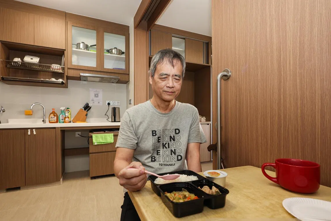 Mr Tay Choon Kwan, 69, a retired account assistant, having his catered dinner in his flat. Residents can top up for optional services such as laundry, housekeeping and catering.