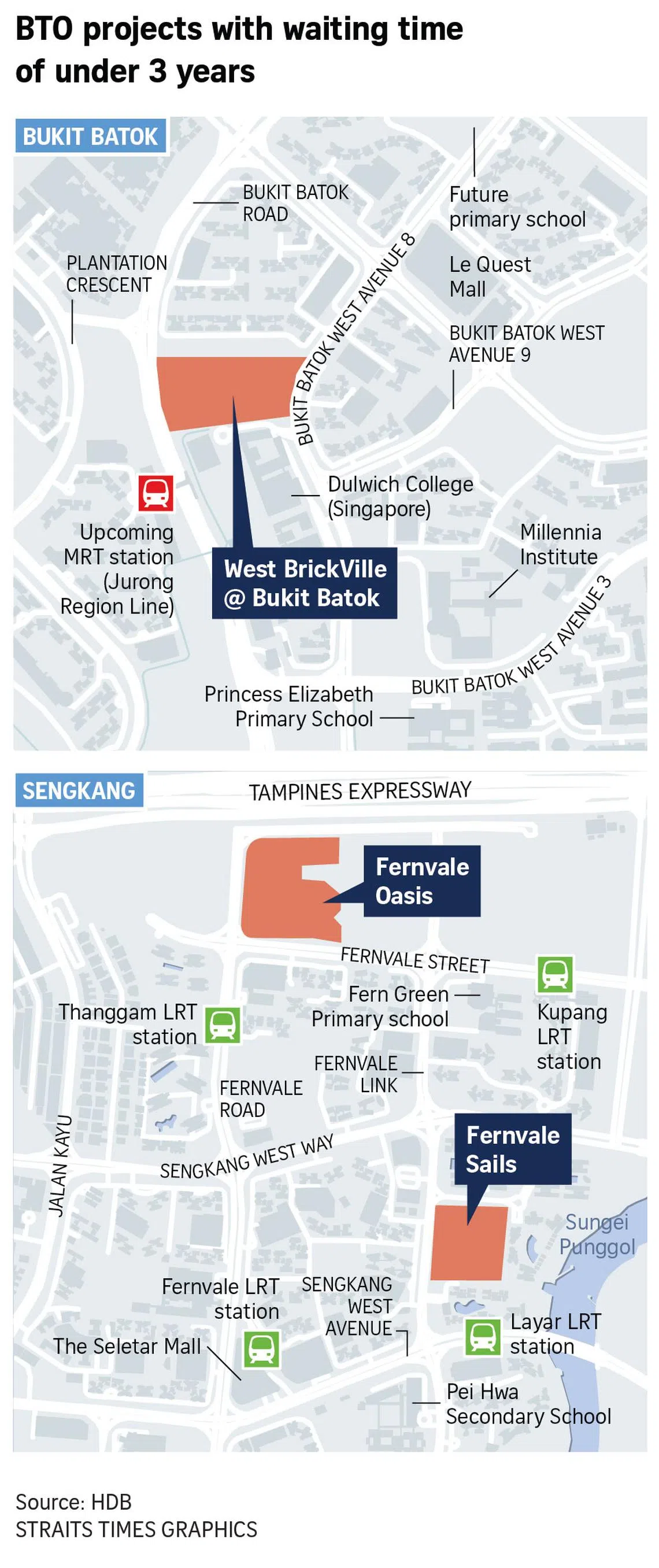 SINGAPORE – Home buyers in the upcoming Build-to-Order (BTO) sales exercise in October will have to wait less than three years for their units, with the launch of 2,085 flats in three projects in Bukit Batok and Sengkang.