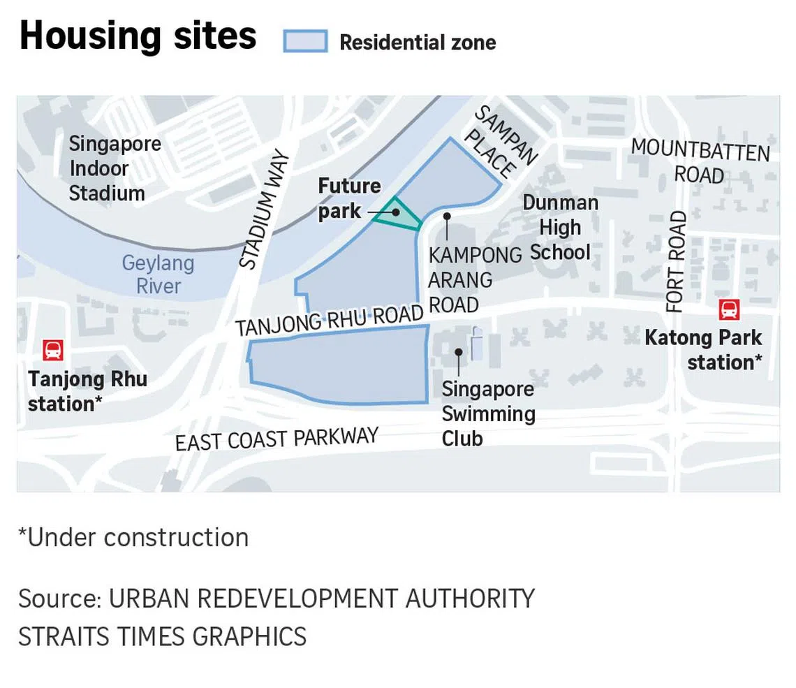 Located across Geylang River from the Singapore Sports Hub, the three plots (right) are within 1km of either Tanjong Rhu or Katong Park MRT stations, and are within walking distance to a park connector that leads to Marina Bay.