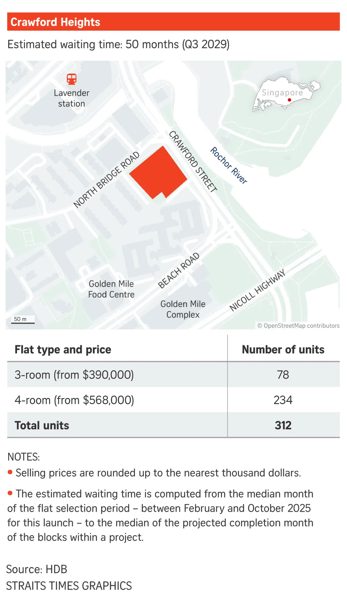 At Prime project Crawford Heights, prices (without grants) range from $390,000 to $523,000 for a three-room home, and $568,000 to $759,000 for a four-room flat, making these units among the priciest at this launch.