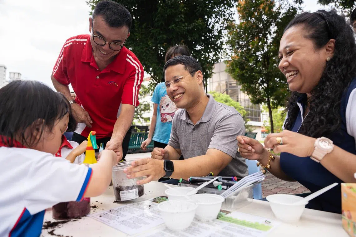 National Development Minister Desmond Lee (centre) taking part in a planter maker activity with children and staff of PCF Sparkletots Preschool on April 27.