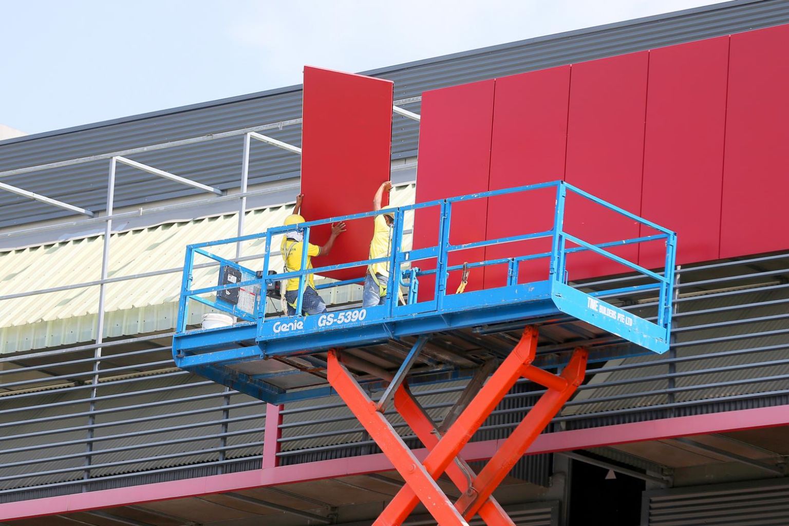 Workers removing external cladding panels at 3, Pioneer Sector 3, that do not meet the Fire Code on Aug 25, 2017.