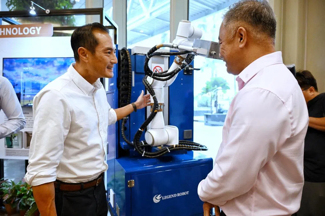 Mr Toh Chee Boon, deputy managing director of Hi-Tek Construction (right), showing Senior Minister of State for National Development Tan Kiat How a painting robot that his company has deployed at a Build-To-Order construction site in MacPherson.