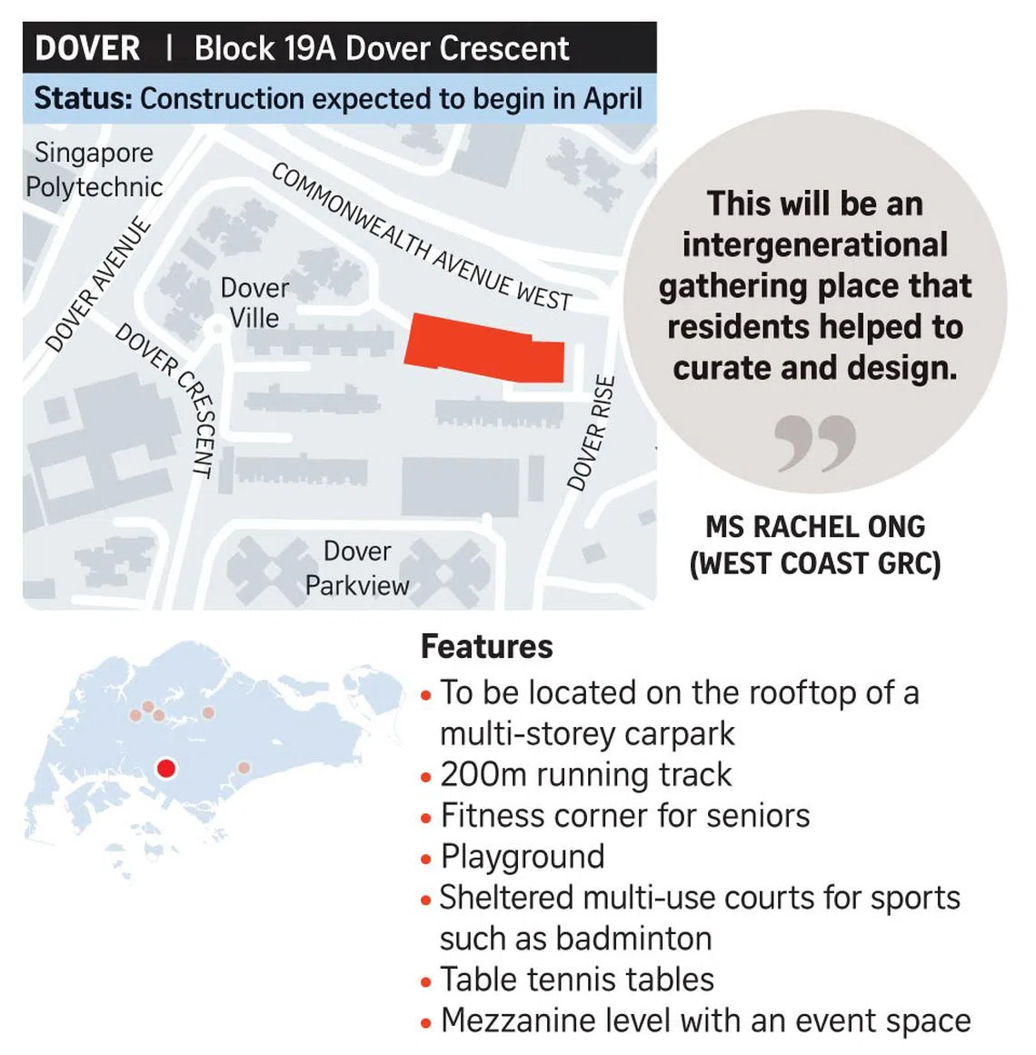 Ms Rachel Ong, an MP for West Coast GRC, said the rooftop of the multi-storey carpark at Block 19A Dover Crescent will be transformed into a facility that features a 200m running track, sheltered multi-use courts for sports like badminton, a fitness corner, table tennis tables and a mezzanine level with an events space.