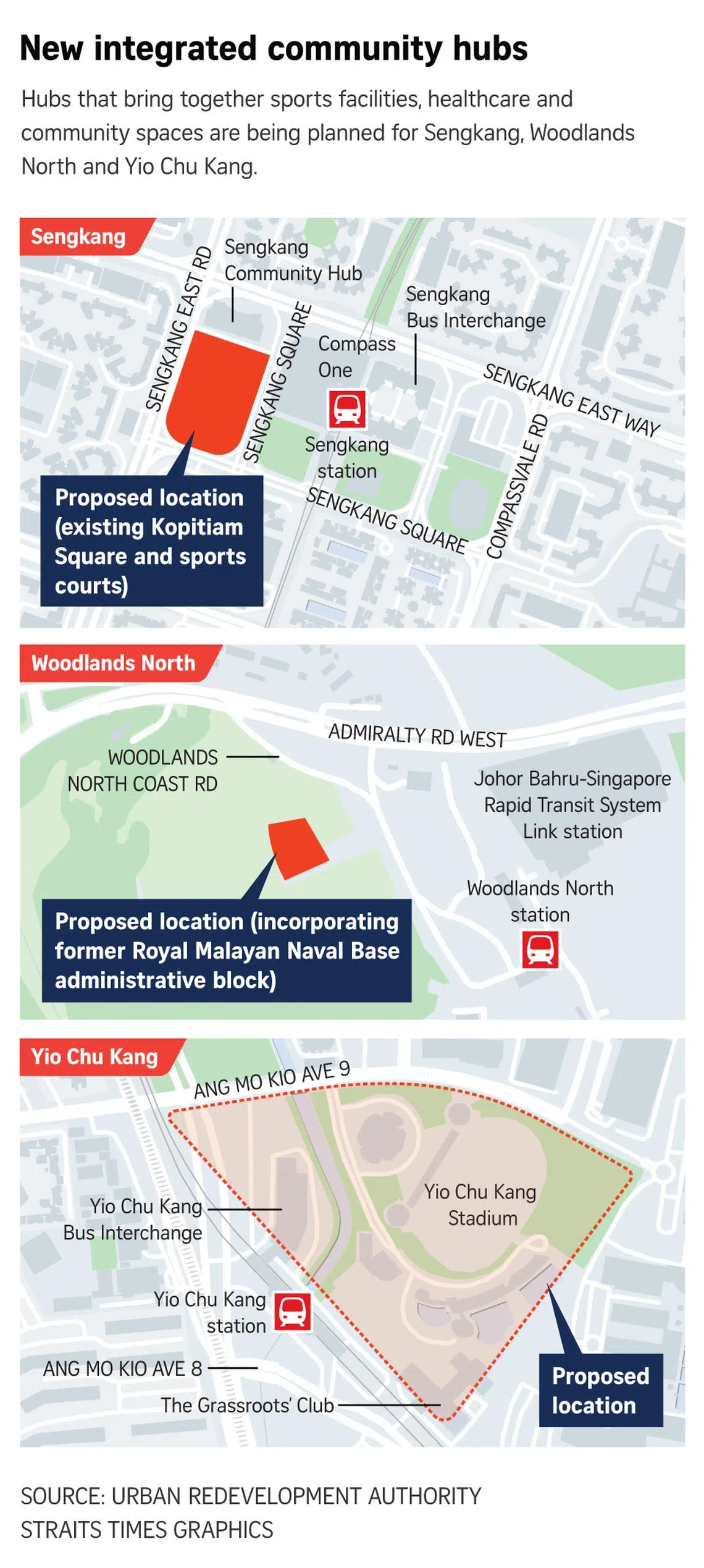 SINGAPORE – Residents of Sengkang, Woodlands North and Yio Chu Kang can look forward to having recreational facilities and other amenities under one roof at new integrated community hubs proposed for the towns.