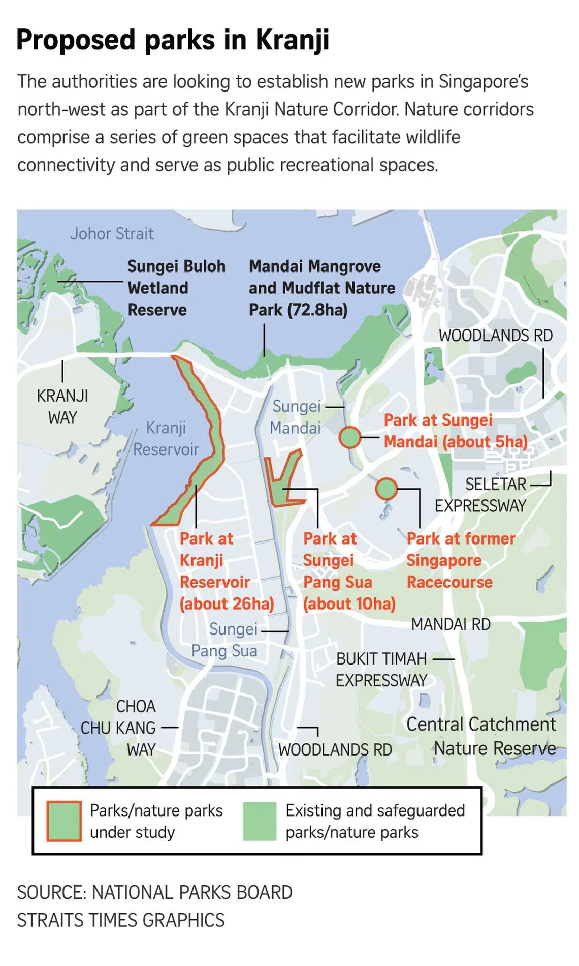 As for the parks under study as part of the Kranji Nature Corridor, all four will be near existing water bodies in the area and complement the upcoming 72.8ha Mandai Mangrove and Mudflat Nature Park, which is set to open in 2028