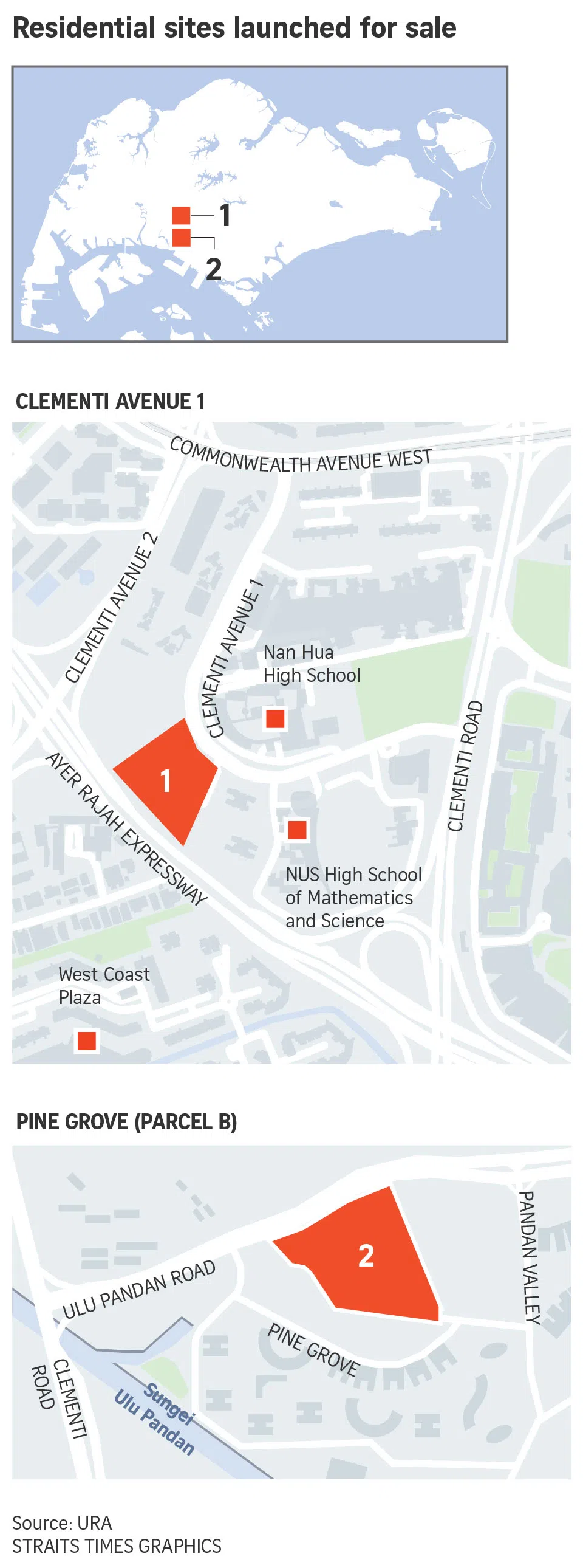 SINGAPORE - Two 99-year leasehold government land sites in Clementi Avenue 1 and Pine Grove in Ulu Pandan have been launched for sale via public tender.