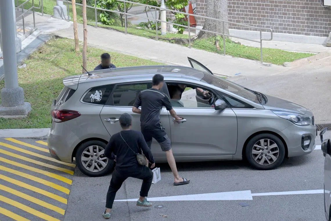 A person (in green shirt) detained during a sting operation at a carpark in Bishan Street 13 on July 10.