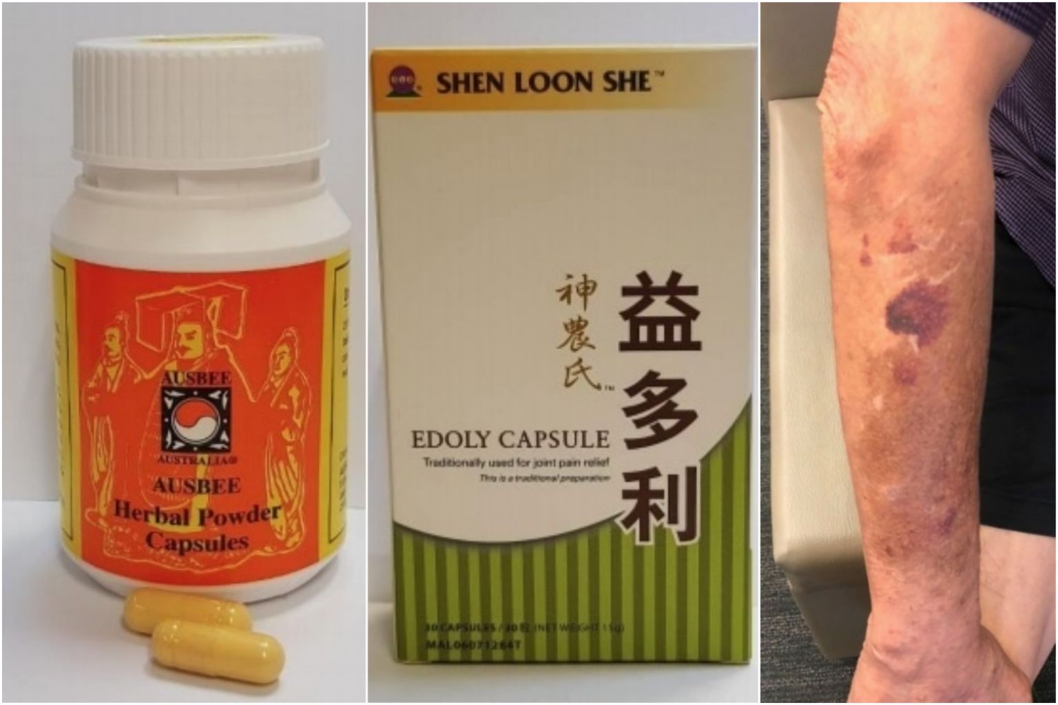 Ausbee Australia Ausbee Herbal Powder Capsules (left) and Shen Loon She Edoly Capsule (centre). A man in his 60s developed Cushing's syndrome after taking Shen Loon She Edoly Capsule for almost a decade to relieve joint pain.