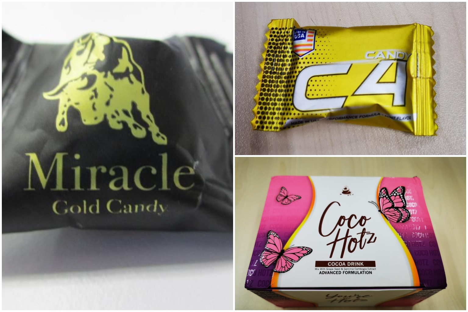 The products' labels carried exaggerated claims that are not expected to be present in candy products, such as "increase the strength and health of men" for Miracle Gold Candy, and "prevent premature ejaculation" and "help those with gout, diabetes and high blood pressure" for C4 Candy.