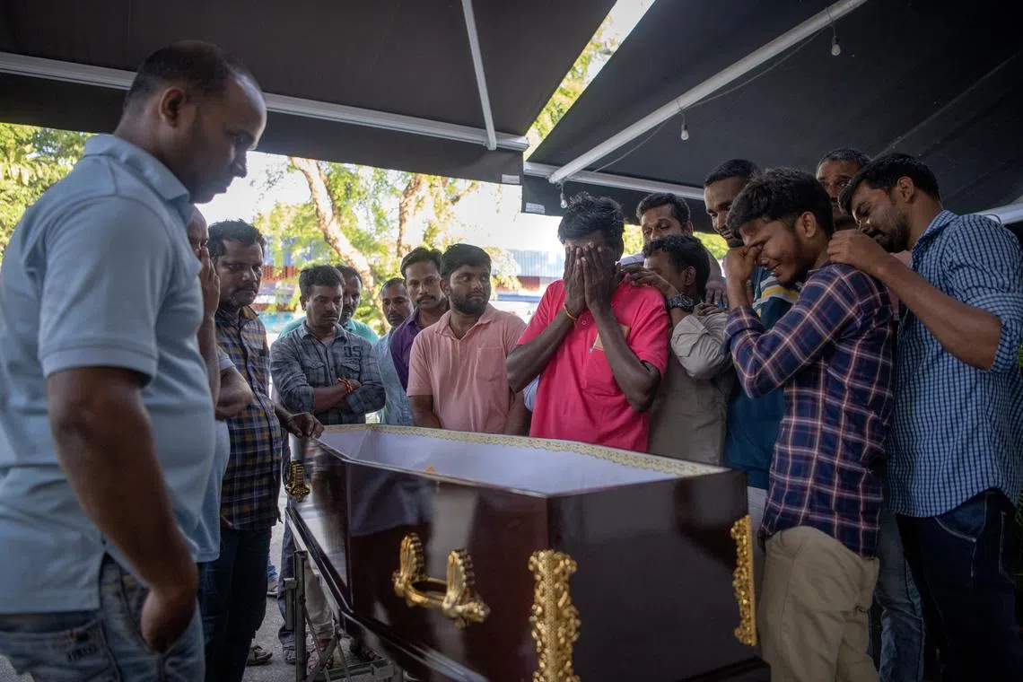 Fellow workers and distant family members of the deceased worker Mr Vinoth Kumar mourning outside Jin Lu Funeral Service on Friday.