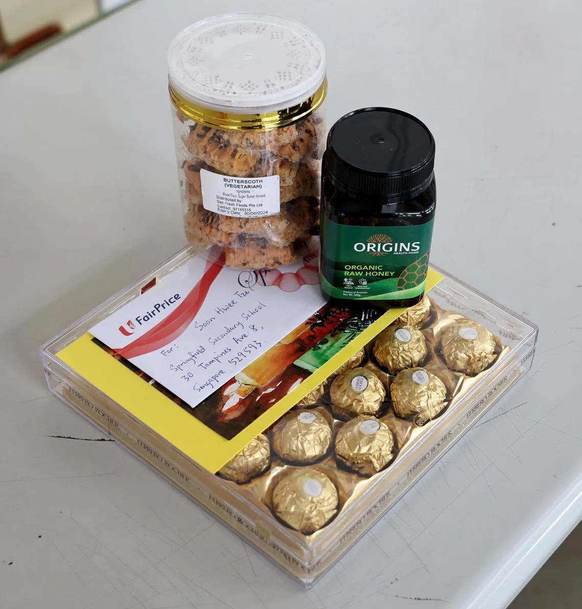 A donor gifted Hwee Tze an assortment of goodies and FairPrice vouchers.