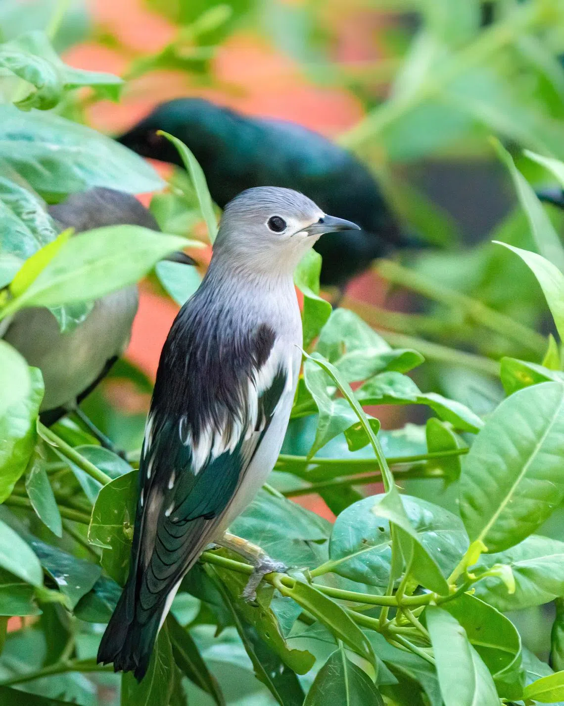 Sporting a pale grey head and underparts, the male daurian starling has glossy, iridescent feathers in dark hues of green and purple.