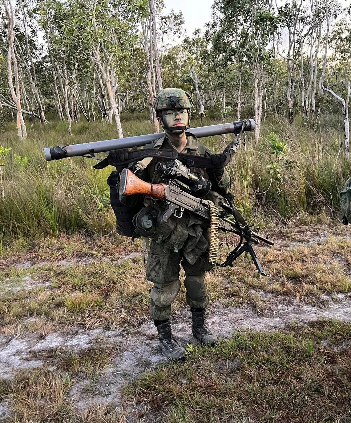 Captain Yap Hui Jun during her last mission in phase three of the Ranger Course. She is carrying a general purpose machine gun that weighs 15kg.