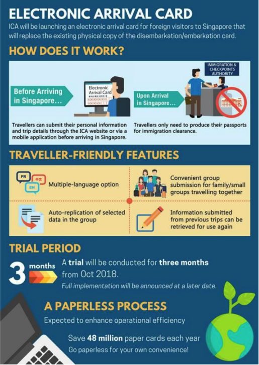 When the electronic arrival card is fully implemented, travellers can submit their personal information and trip details through the ICA website or via a mobile application before arriving in Singapore.