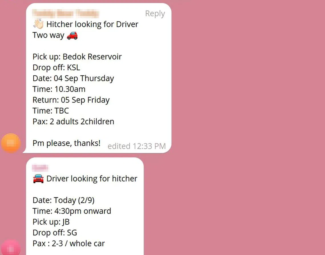 “I usually go on Facebook and Telegram groups to look for such services, and have successfully negotiated with drivers to drive me from Johor Bahru to Tampines for between $25 and $30,” said Mr Fong, who books these rides about eight times a year.
