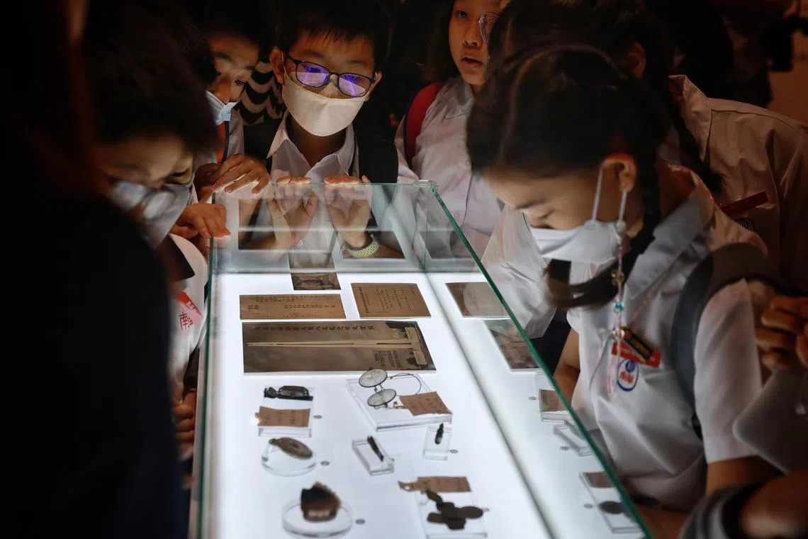 Nan Hua Primary School pupils viewing the artefacts at the Civilian War Memorial special exhibition on Wednesday.