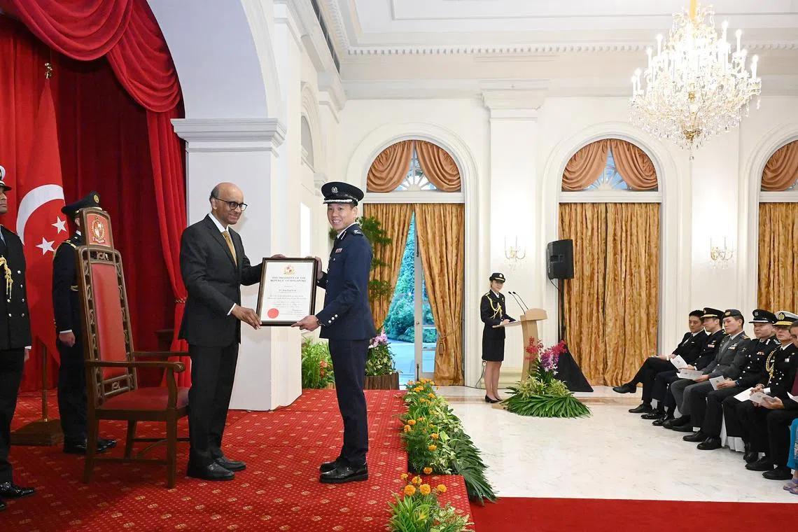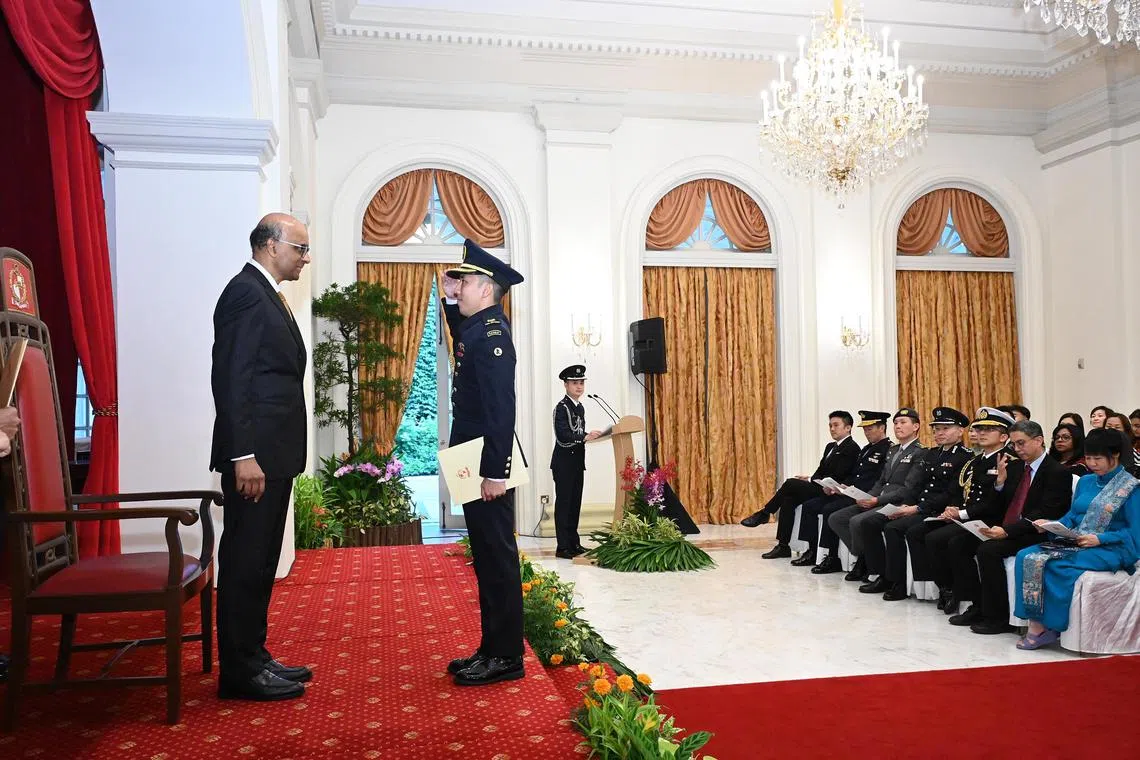 Major Fung Ka Kin saluting President Tharman Shanmugaratnam during the aides-de-camp appointment ceremony at the Istana on May 27.