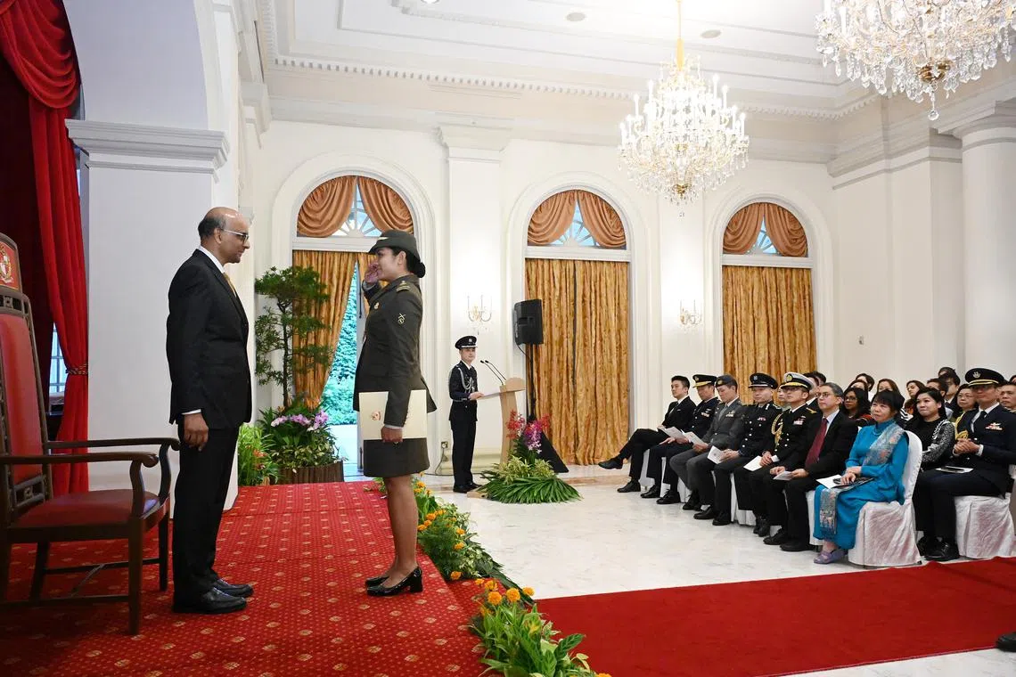 Military Expert 4 Fadilah Jubir saluting President Tharman Shanmugaratnam during the aides-de-camp appointment ceremony at the Istana on May 27.