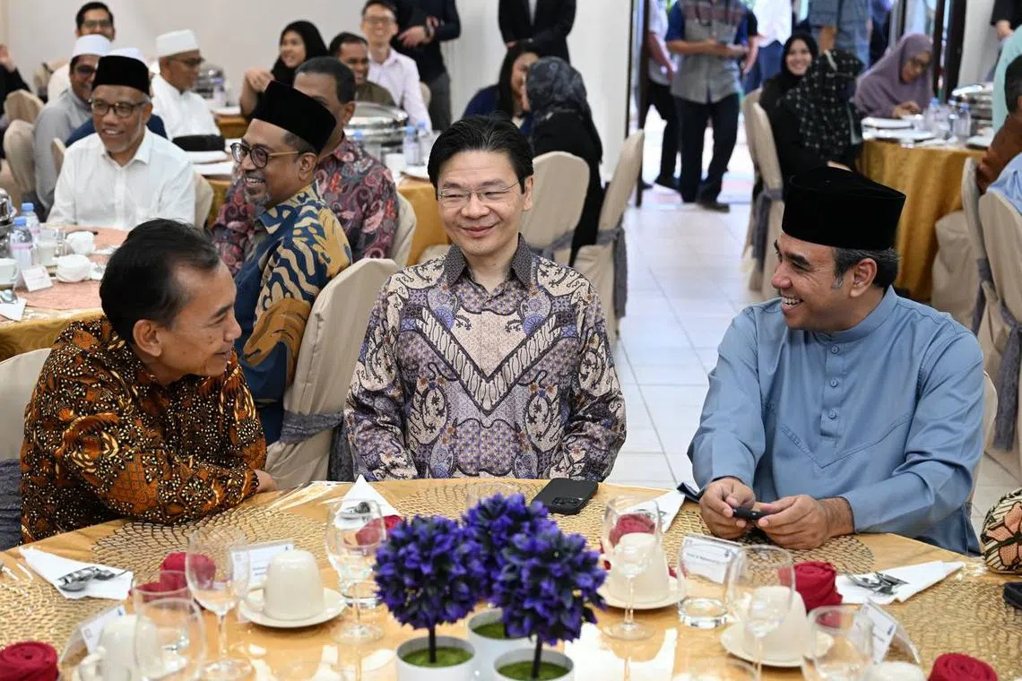 DPM Lawrence Wong (centre) chatting with Ustaz Mohamed Ali (right), chairman of Khadijah Mosque and co-chairman of the Religious Rehabilitation Group, and Islamic Religious Council of Singapore president Mohamed Sa’at Abdul Rahman at Khadijah Mosque.