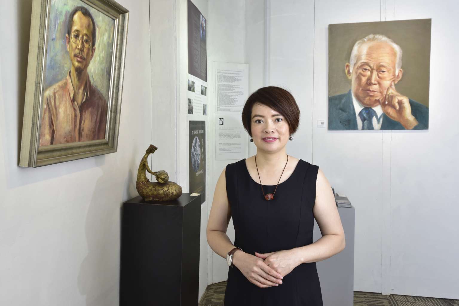 Madam Li Zhengxiu standing between a portrait of her late husband, artist Qu Jinzhong, and that of Mr Lee Kuan Yew.