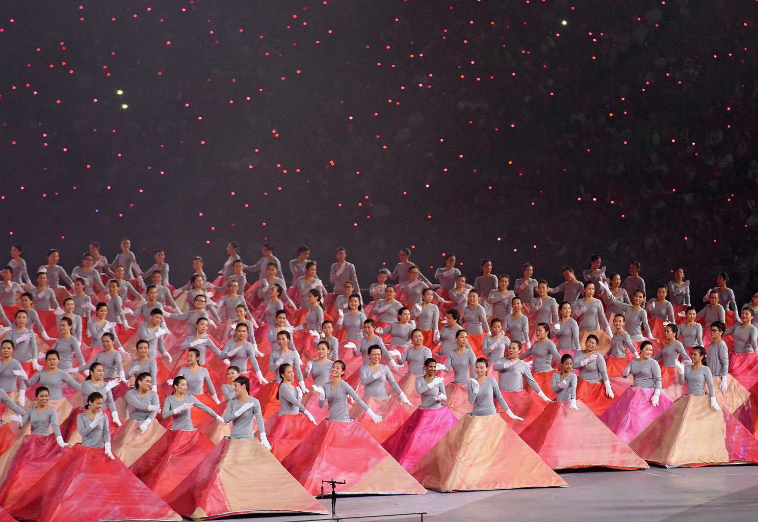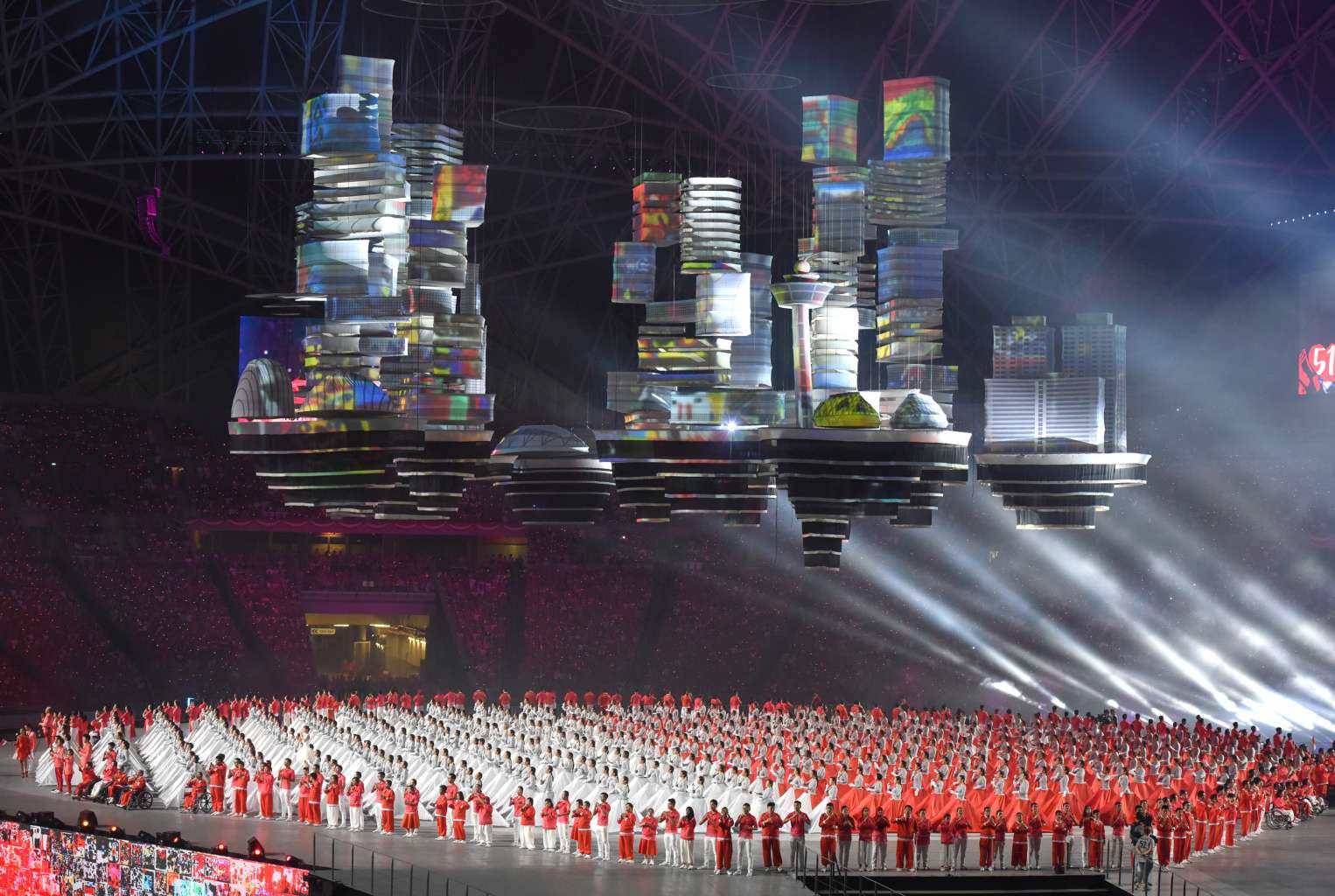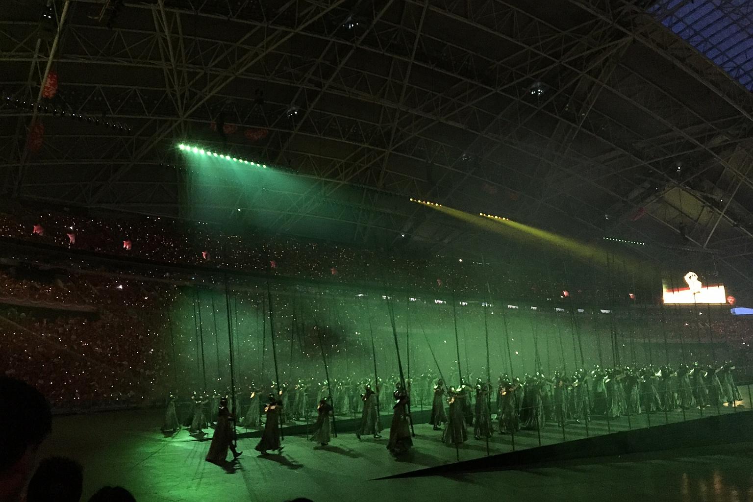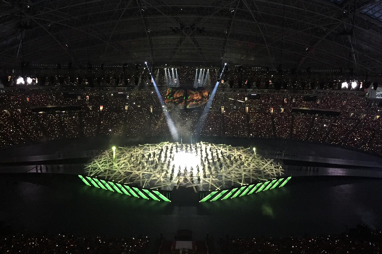 The outdoor fireworks display, set off from the roof of the stadium and three barges on the Kallang Basin.