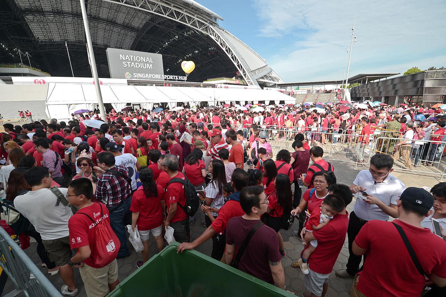 Parade-goers queue up for a security check prior to entering the National Stadium.
