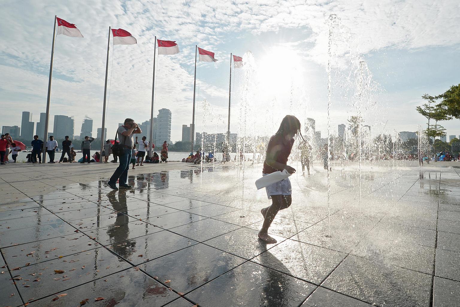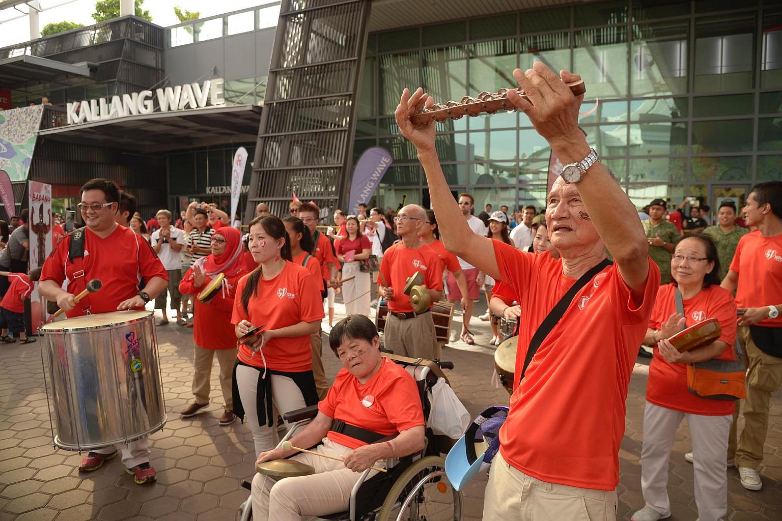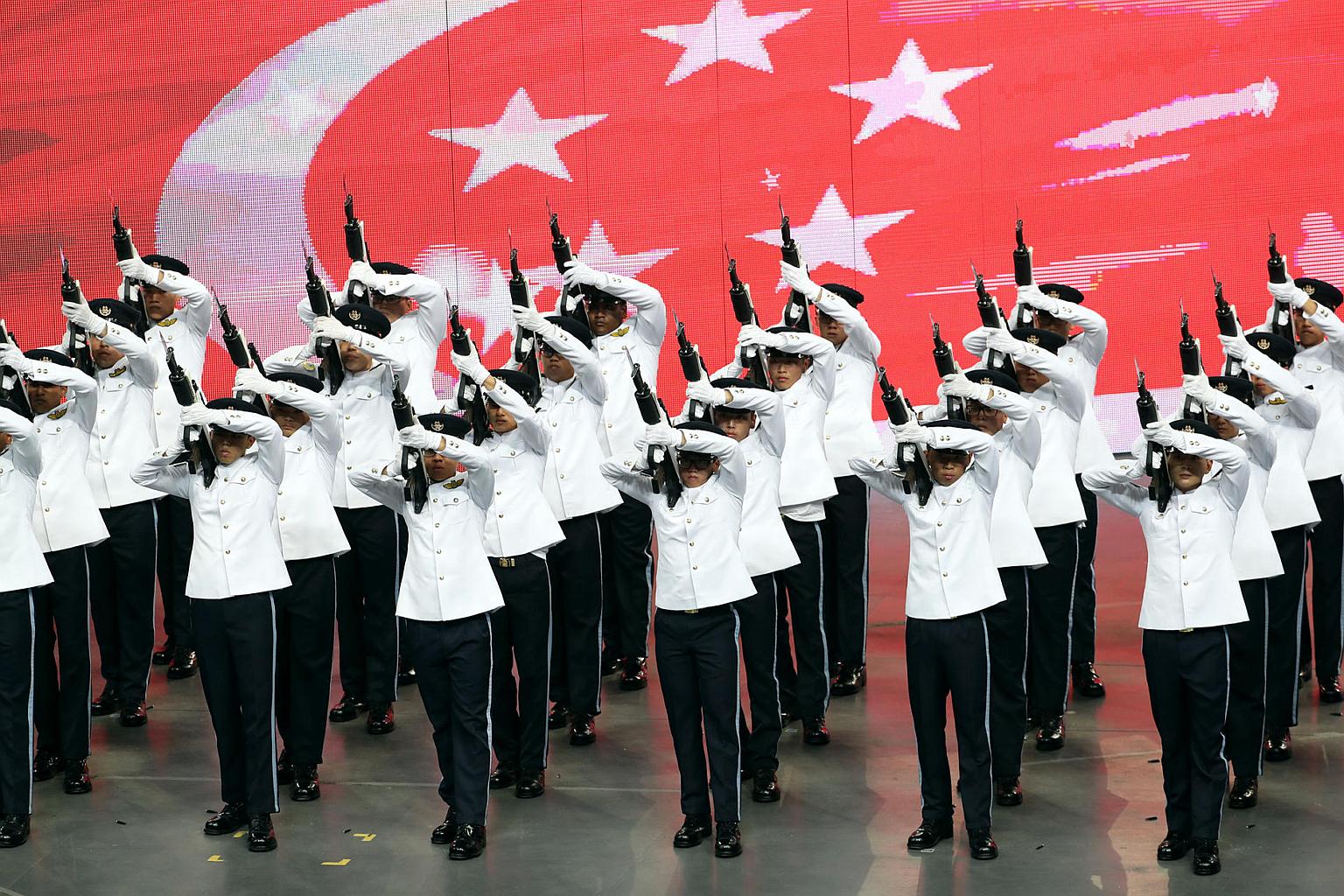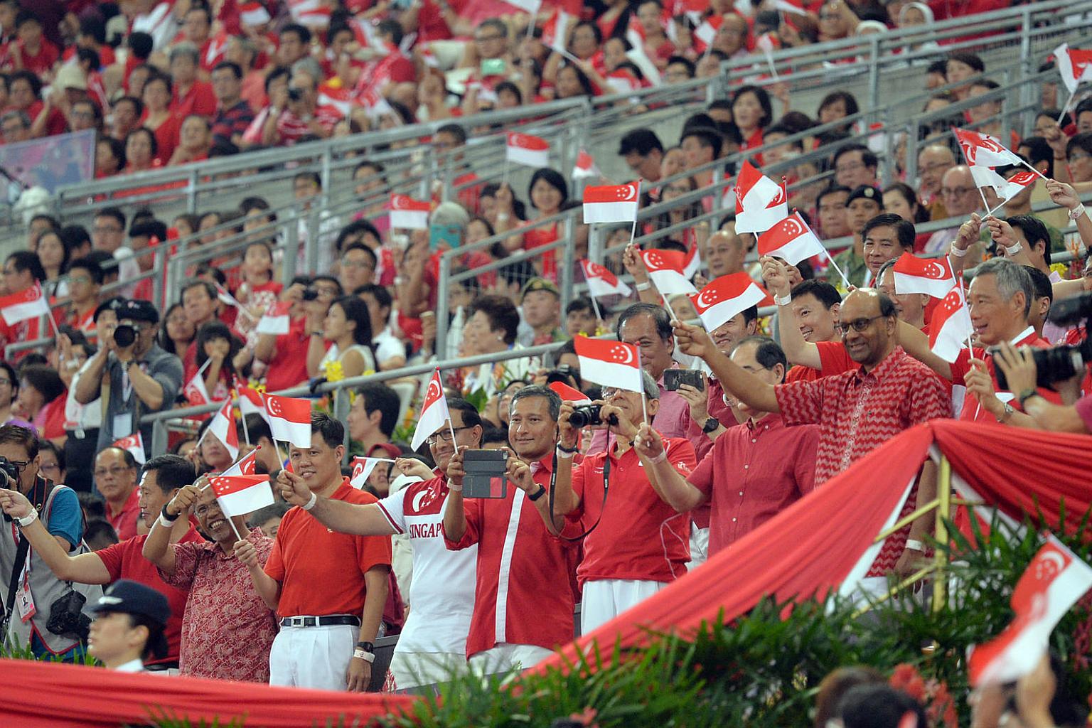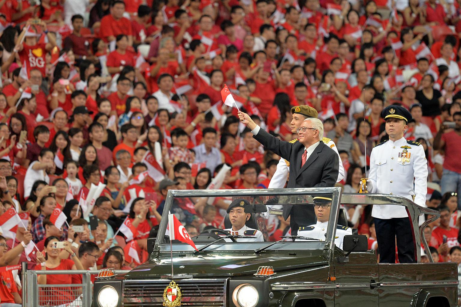 President Tan waves a Singapore flag as he greets the crowd during the drive-past.