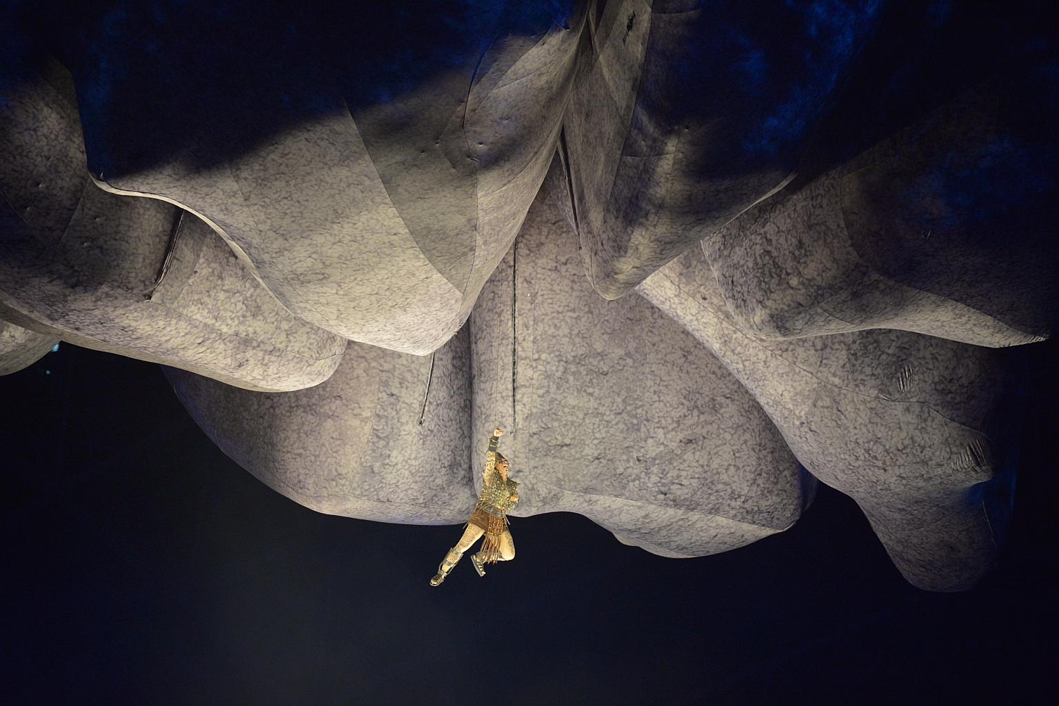 Badang - played by theatre practitioner and band singer Rizman Putra Ahmad Ali - soars above his enemies as he flies up to split a giant boulder.