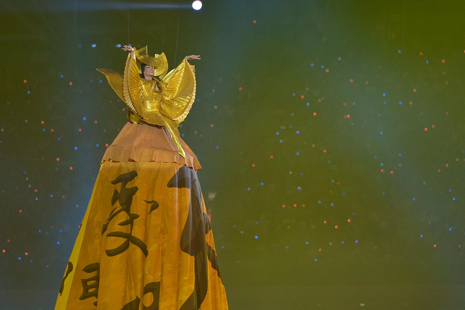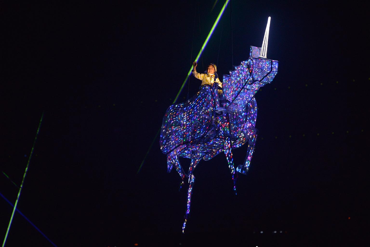 The highlight of Act 3's Dare to Dream - a glittery unicorn ridden by 7-year-old Minejima-Lee Kai gallops across the stadium.