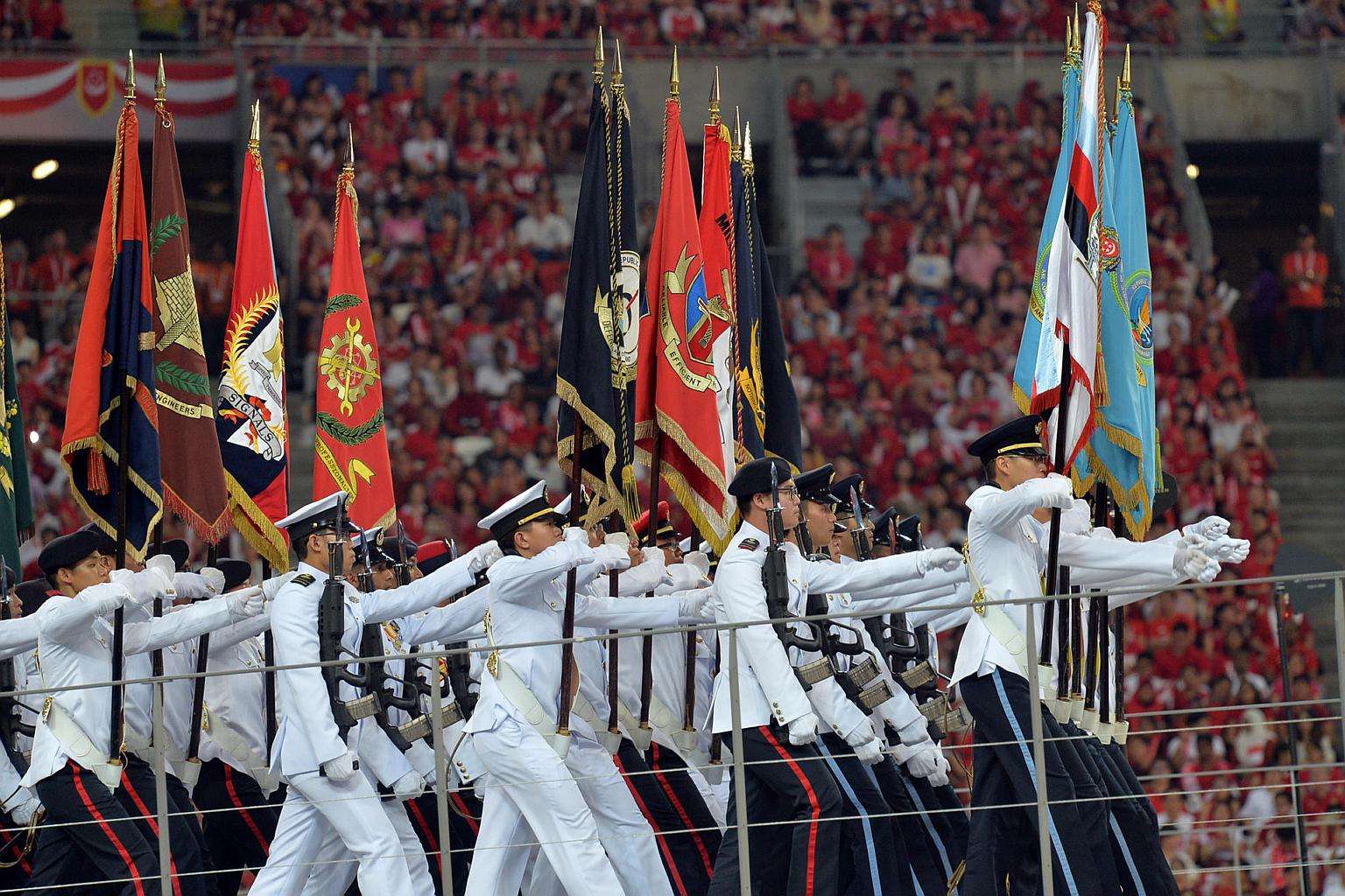 Ministers, including PM Lee, stand up in the VIP box to greet the arrival of President Tony Tan Keng Yam.