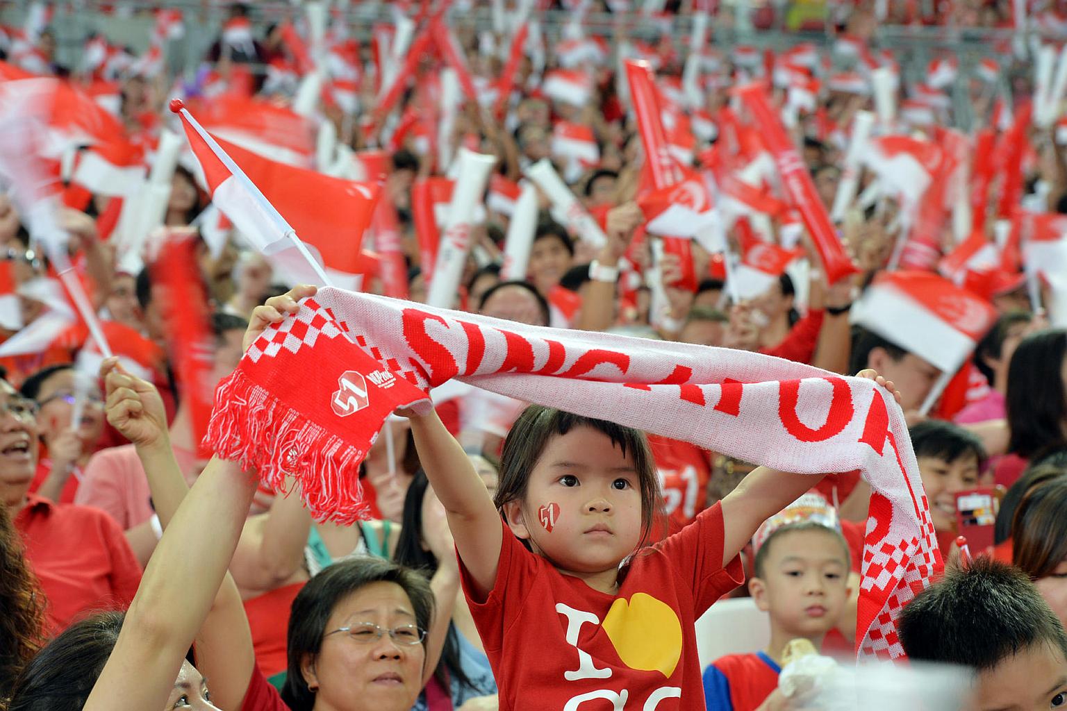 A young girl in the stadium crowd holds aloft a Singapore scarf.