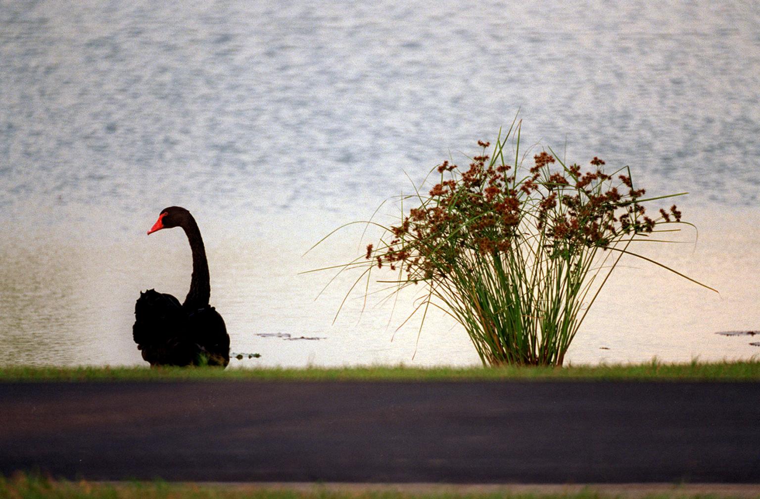 A black swan waits for feeding time. Visitors typically bring slices of bread to feed the swans and fish at the lake.