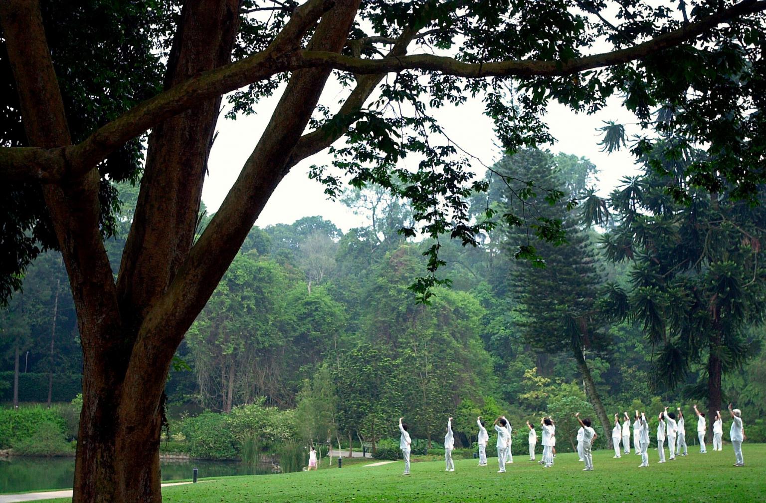 A group of people moving in a mix of dance and qigong movements known as yuan ji wu at the Botanic Gardens.