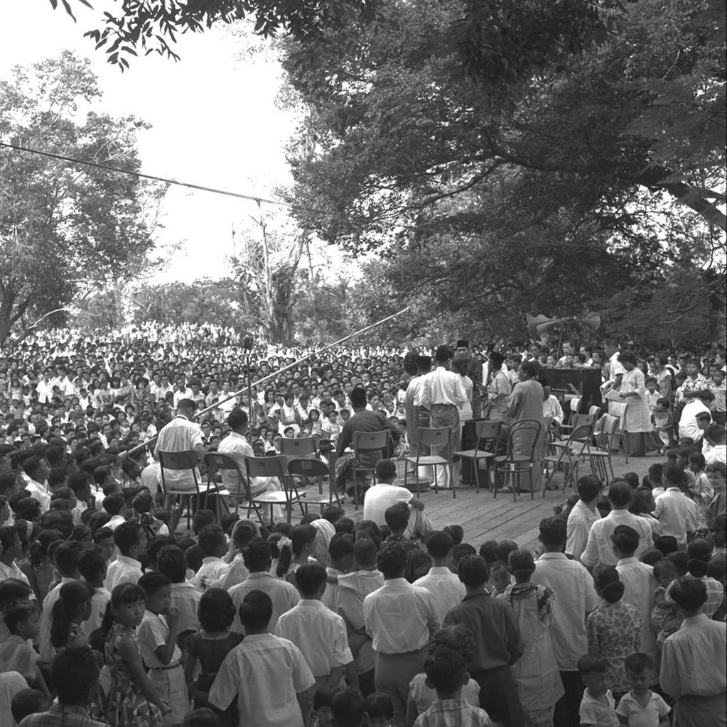 A big crowd at the Botanic Gardens on Aug 2, 1959, for the first performance of Aneka Ragam Rakyat or People’s Variety Show, featuring songs and dances by different racial groups.
